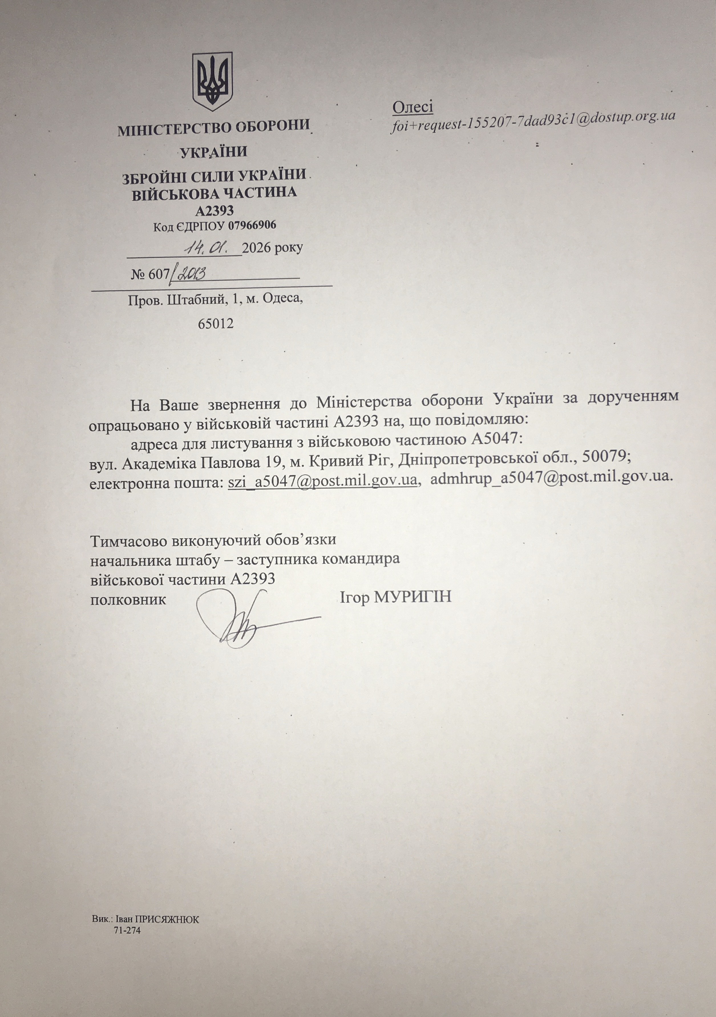 На підставі статей 1, 13, 19, 20 Закону України «Про доступ до публічної інформації» від 13 січня 2011 року, які надають право звертатись із запитами до розпорядників інформації щодо надання публічної інформації, прошу надати наступну інформацію (наступні документи): прошу надати адресу або контакти для зв'язку з військовою частиною А 5047.