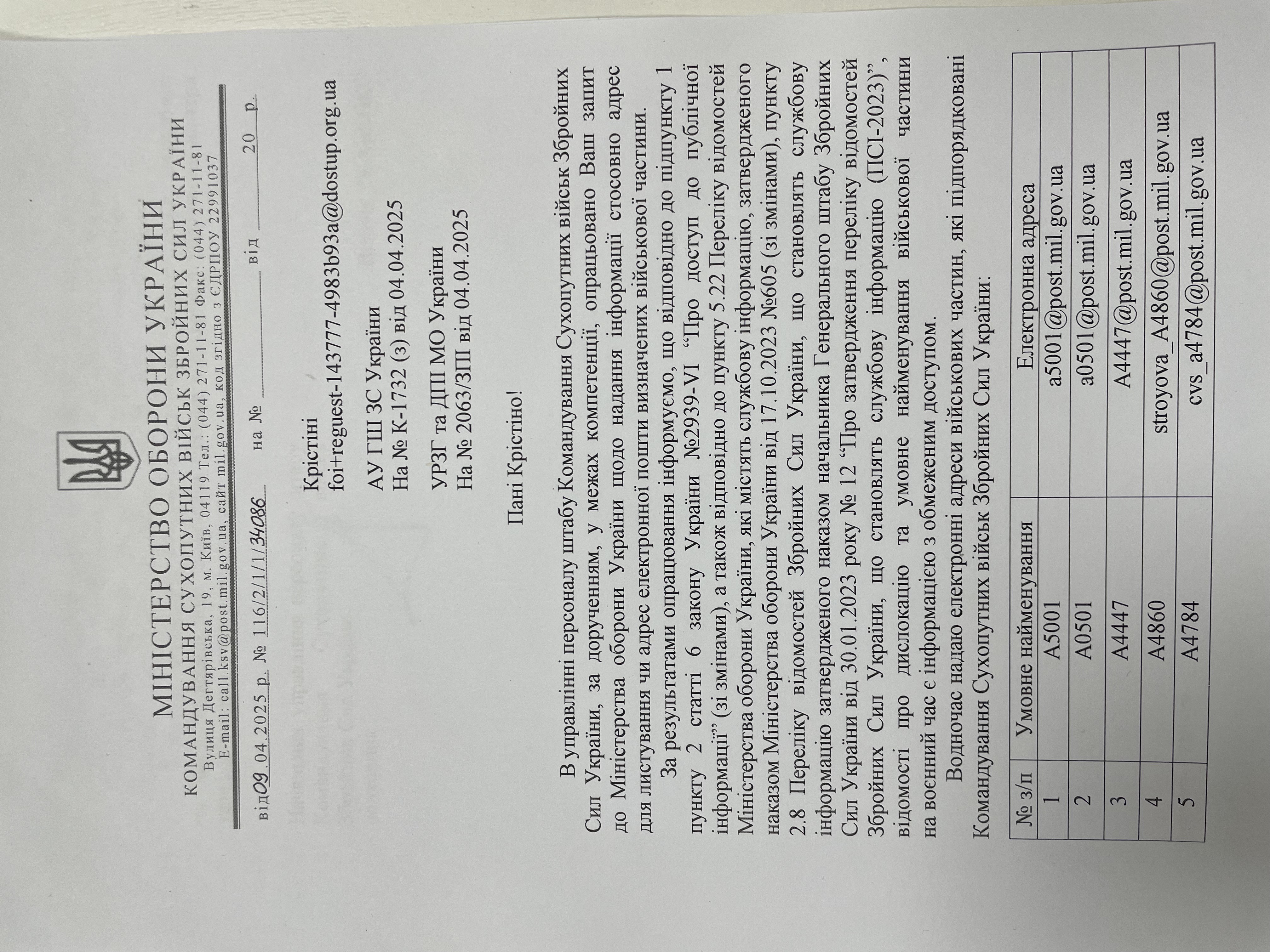 Надайте будь-ласка інформацію про адресу для листування військової частини: А5001, А0501, А4548, А4447, А7052, А4860, А0216, А4784 А0281 , чи можливо адресу електронної пошти зазначених вище військових частин.