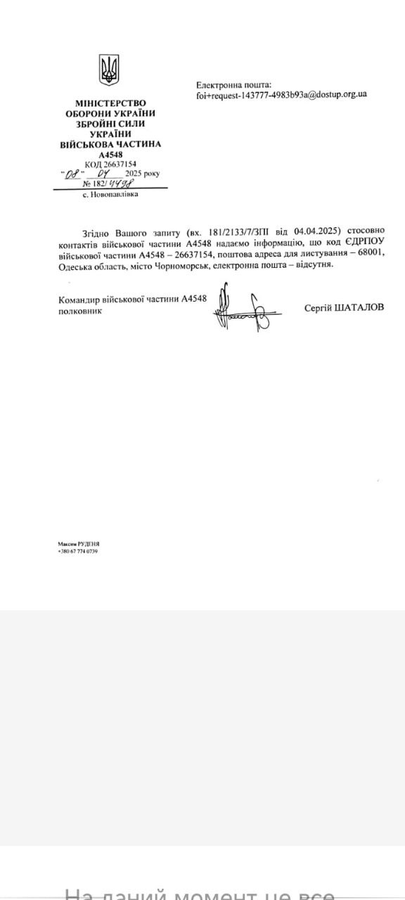Згідно Вашого запиту стосовно контактів військової частини А4548 надаємо