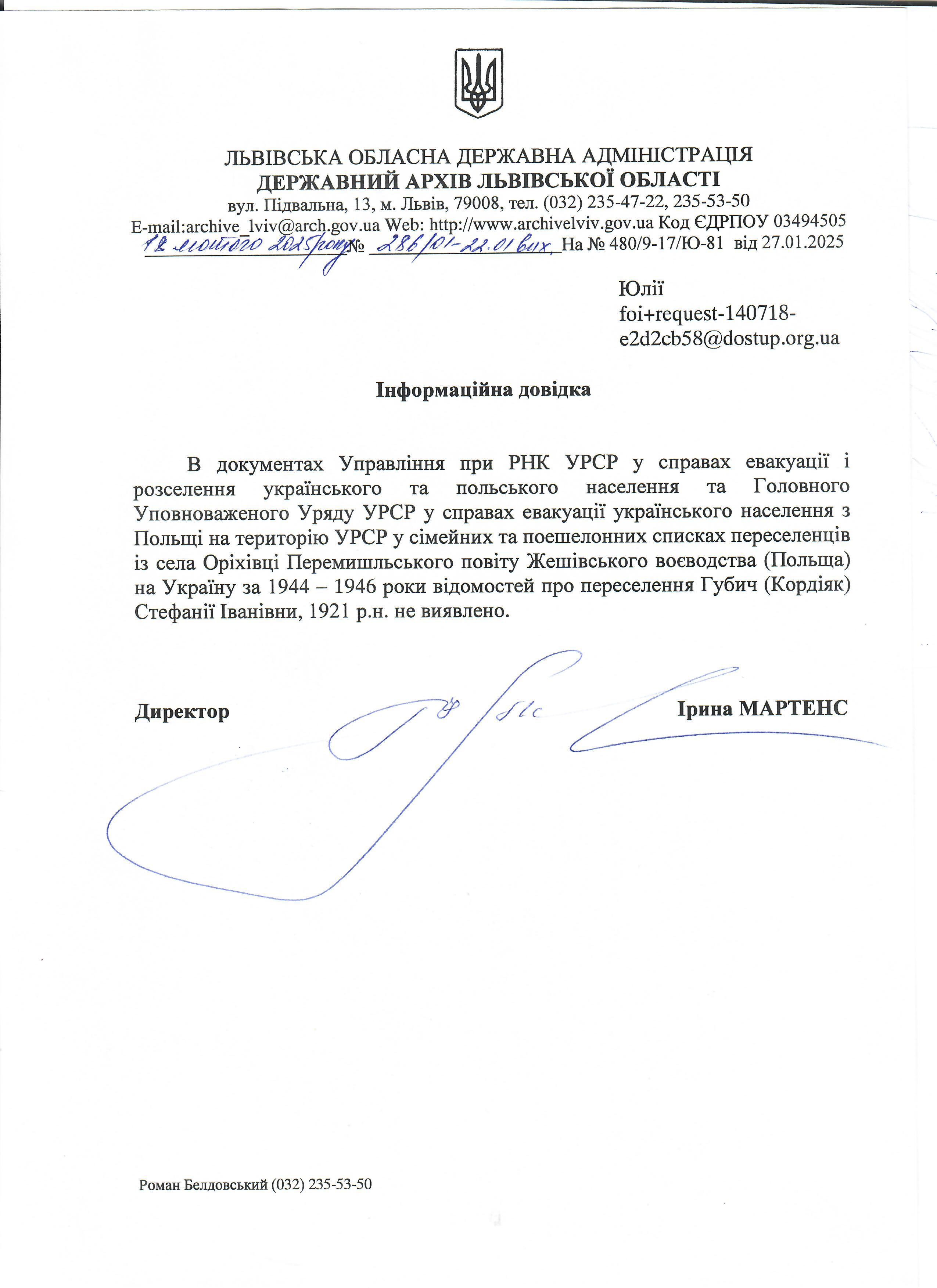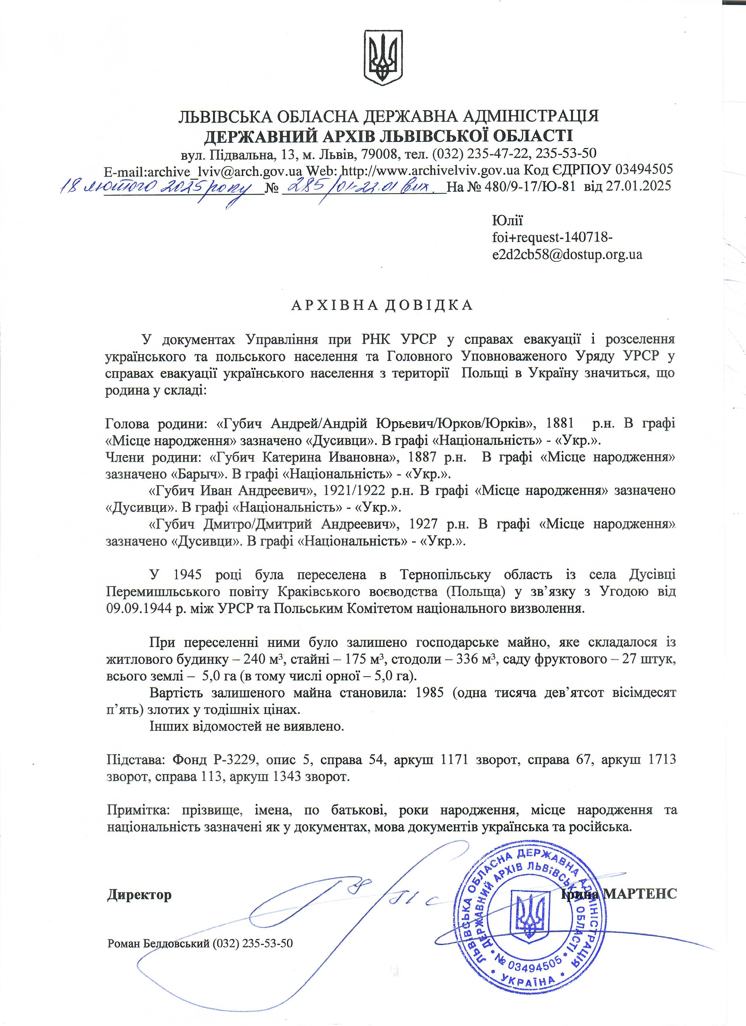 Прошу видати архівну довідку про переселення мого дідуся та бабусі Губич Івана Андрійовича 1921 р.н, село Дусівці ,