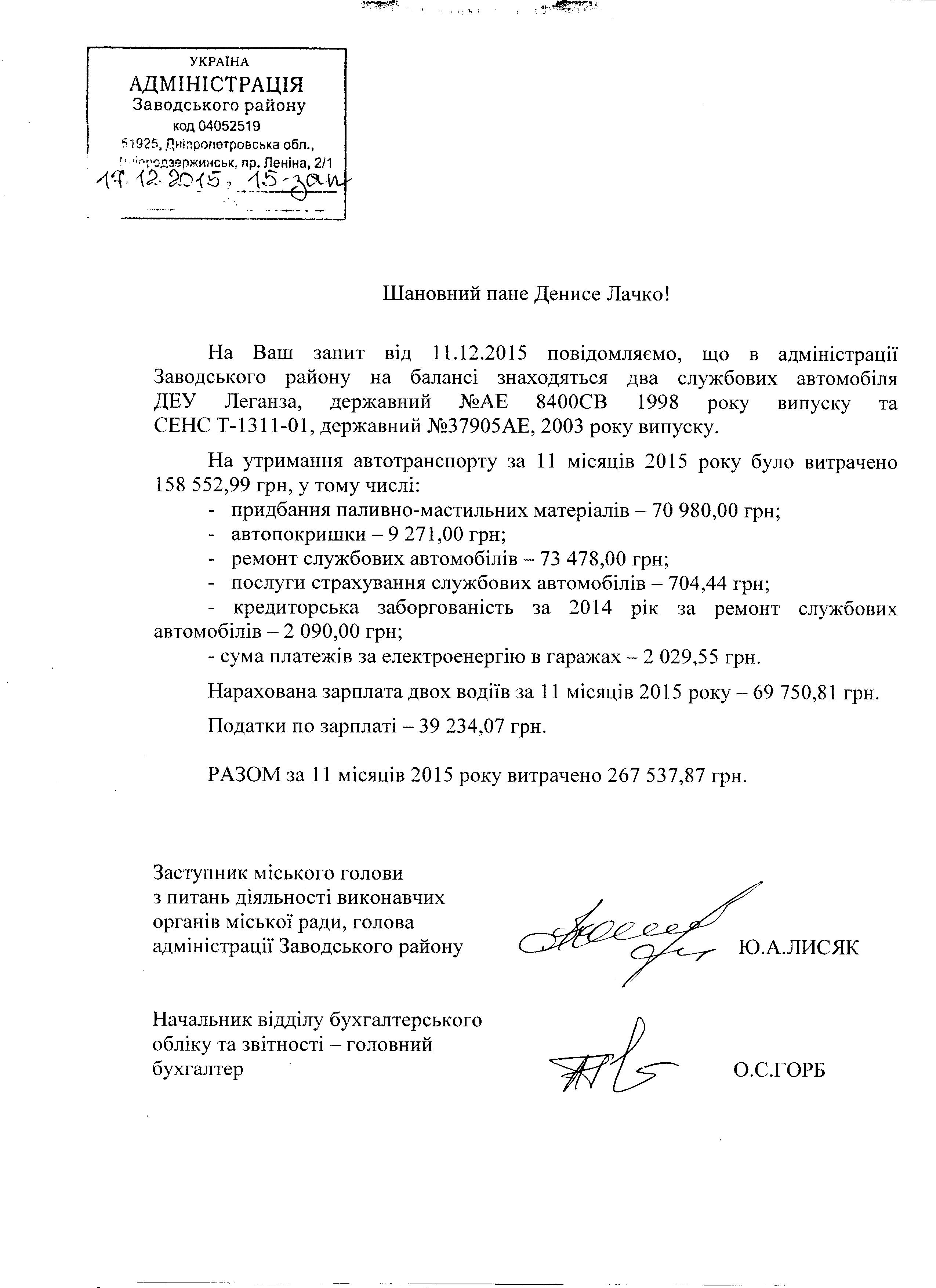 На підставі статей 1, 13, 19, 20 Закону України «Про доступ до публічної інформації» від 13 січня 2011 року, які надають право звертатись із запитами до розпорядників інформації щодо надання публічної інформації, прошу надати наступну інформацію (наступні документи) щодо утримання автопарку Дніпродзержинської міськради, Дніпровської, Заводської та Баглійської районних у місті рад (адміністрацій районів) за 2015 рік.