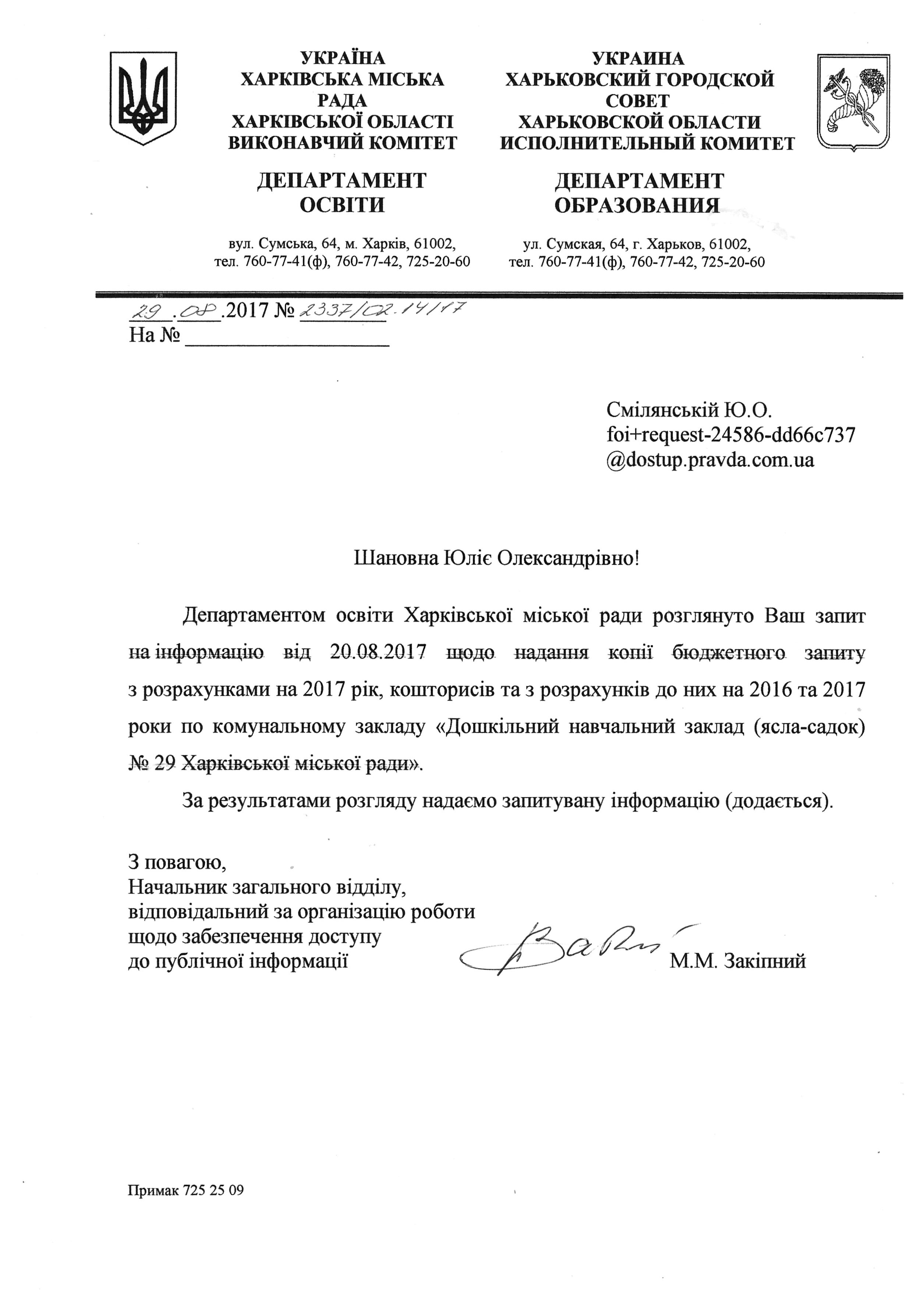 1) Копію «бюджетного запиту» з розрахунками ДНЗ №29 м. Харкова на 2017 рік за підписом керівника закладу.