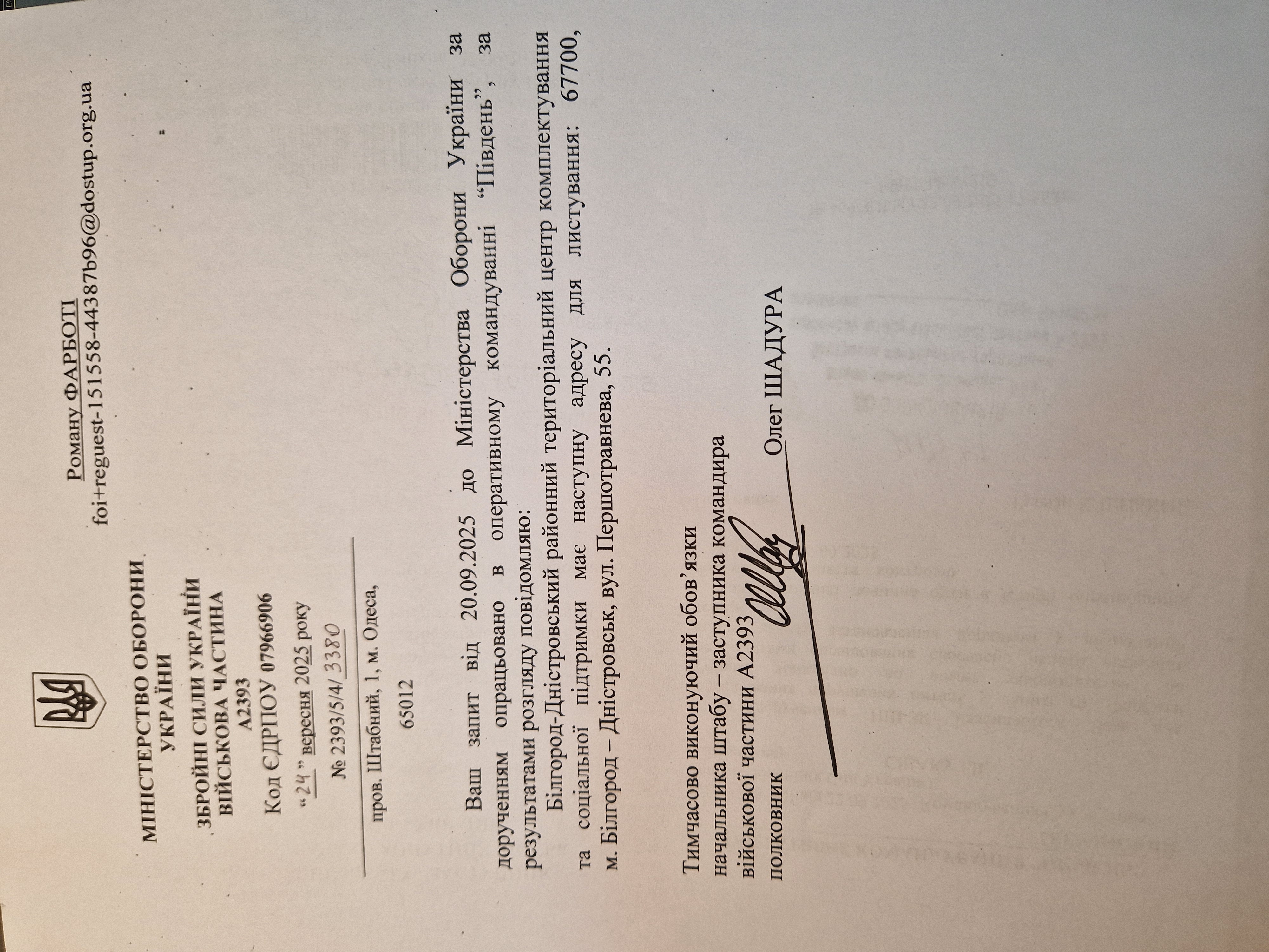 - Юридичну адресу та адресу для листування з Білгород-Дністровським районним територіальним центром комплектації та соціальної підтримки в Одеській області оскільки при пошуку за допомогою пошукових систем видаються адреси, які різняться між собою.