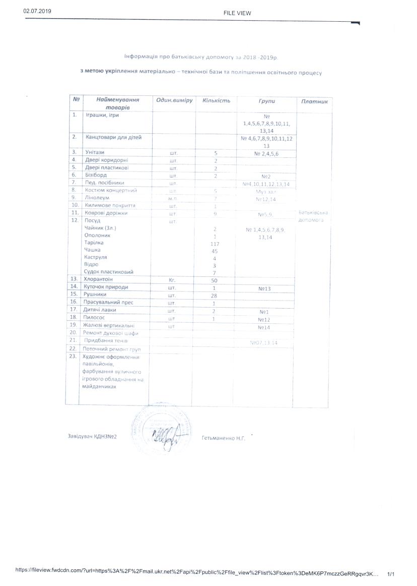 -Звіт про сумму та використання благодійних внесків батьків вихованців КДНЗ(ясла-садок)√2 м.Нікополь Дніпропетровської обл.на 2018-2019рр.