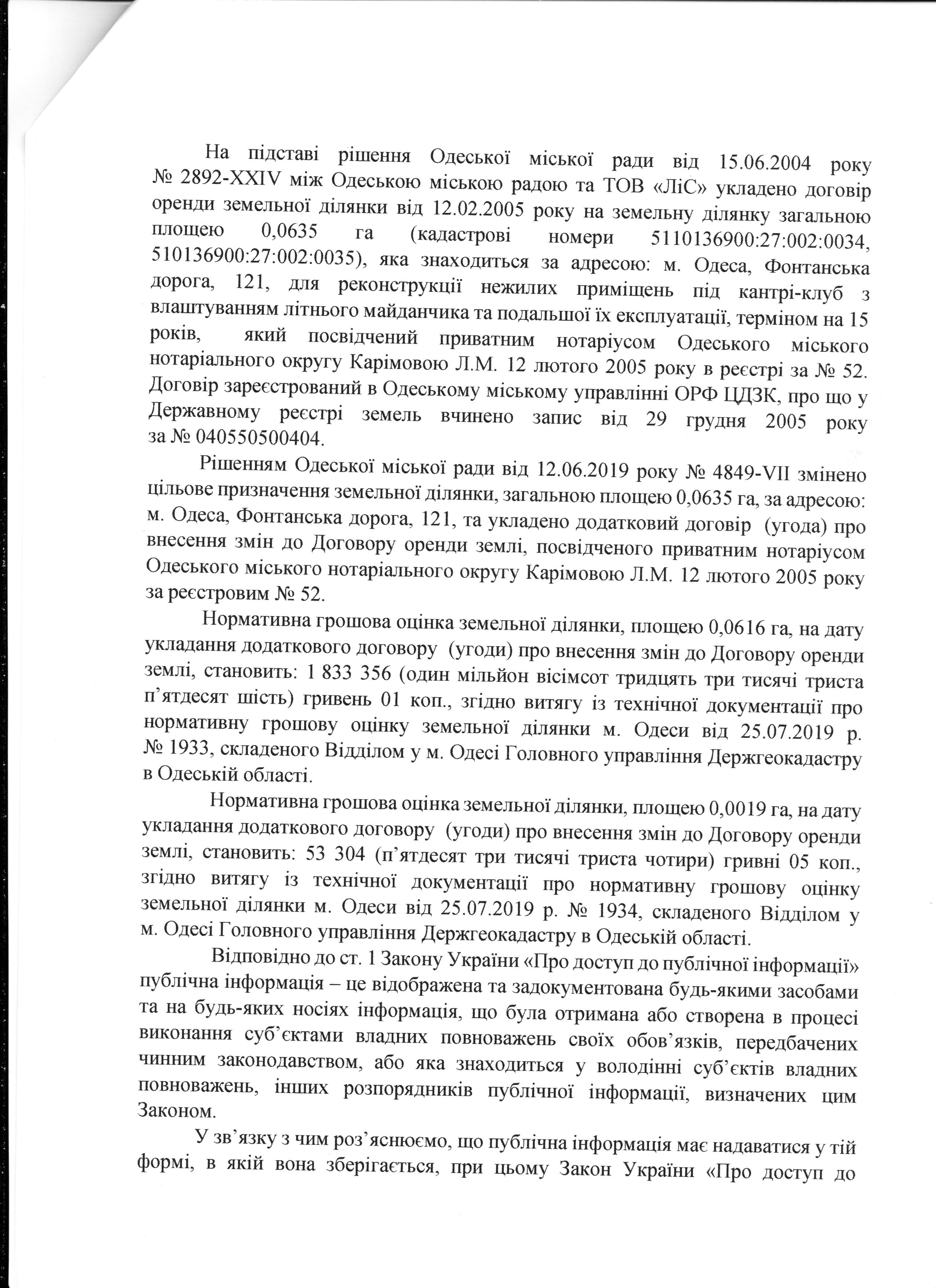 15.01.2020 Департаментом Комунальної власності Одеської міської ради була надана відповідь 01-17/40-ЗПІ, але вона надійшла не у повній формі, лише перші два листка.