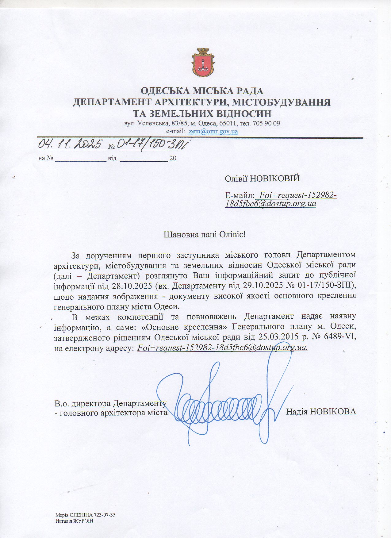 На підставі статей 1, 13, 19, 20 Закону України «Про доступ до публічної інформації» від 13 січня 2011 року, які надають право звертатись із запитами до розпорядників інформації щодо надання публічної інформації, прошу надати наступну інформацію (наступні документи): зображення-документ високої якості основного креслення генерального плану міста Одеса.