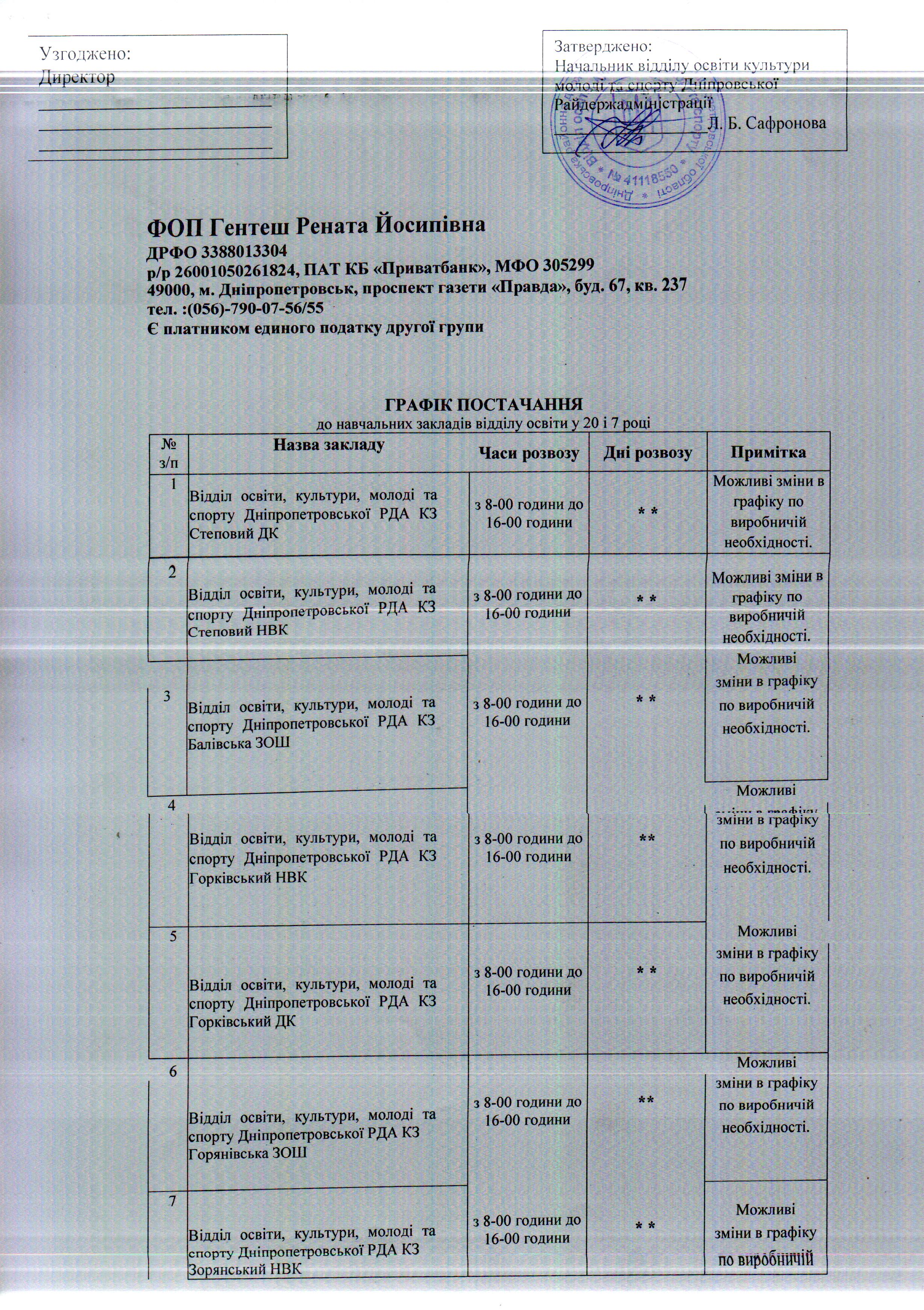 На підставі статей 1, 13, 19, 20 Закону України «Про доступ до публічної інформації» від 13 січня 2011 року, які надають право звертатись із запитами до розпорядників інформації щодо надання публічної інформації, прошу надати наступну інформацію (наступні документи):електронні копії графіків завозу продуктів харчування постачальниками до шкіл району на першу половину жовтня (з 03.09.2017 до 18.09.2017).