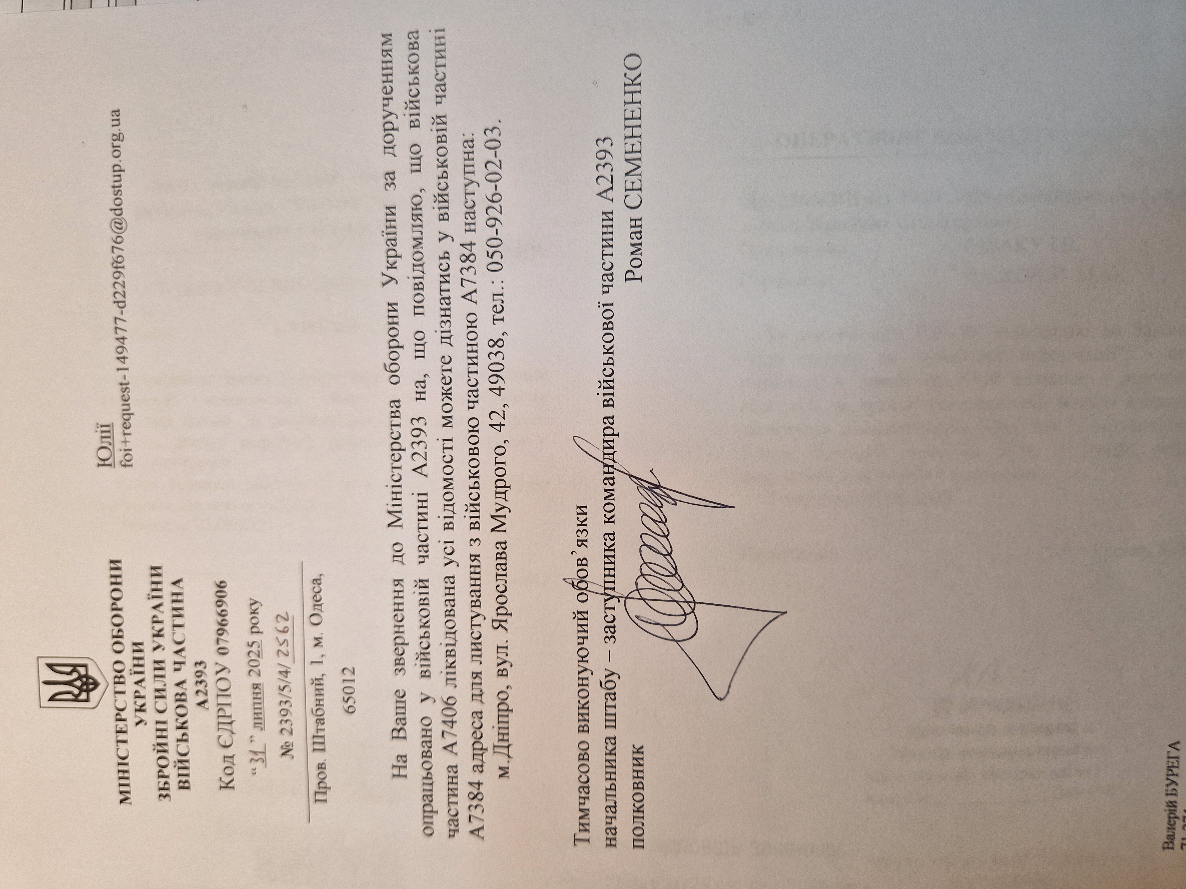 Про контакти правонаступника ВЧ А 7406(7409),для отримання документів сім'ї загиблого військового ЗСУ.На запит ТЦК та СП Військова частина А 7406 не відповідає.