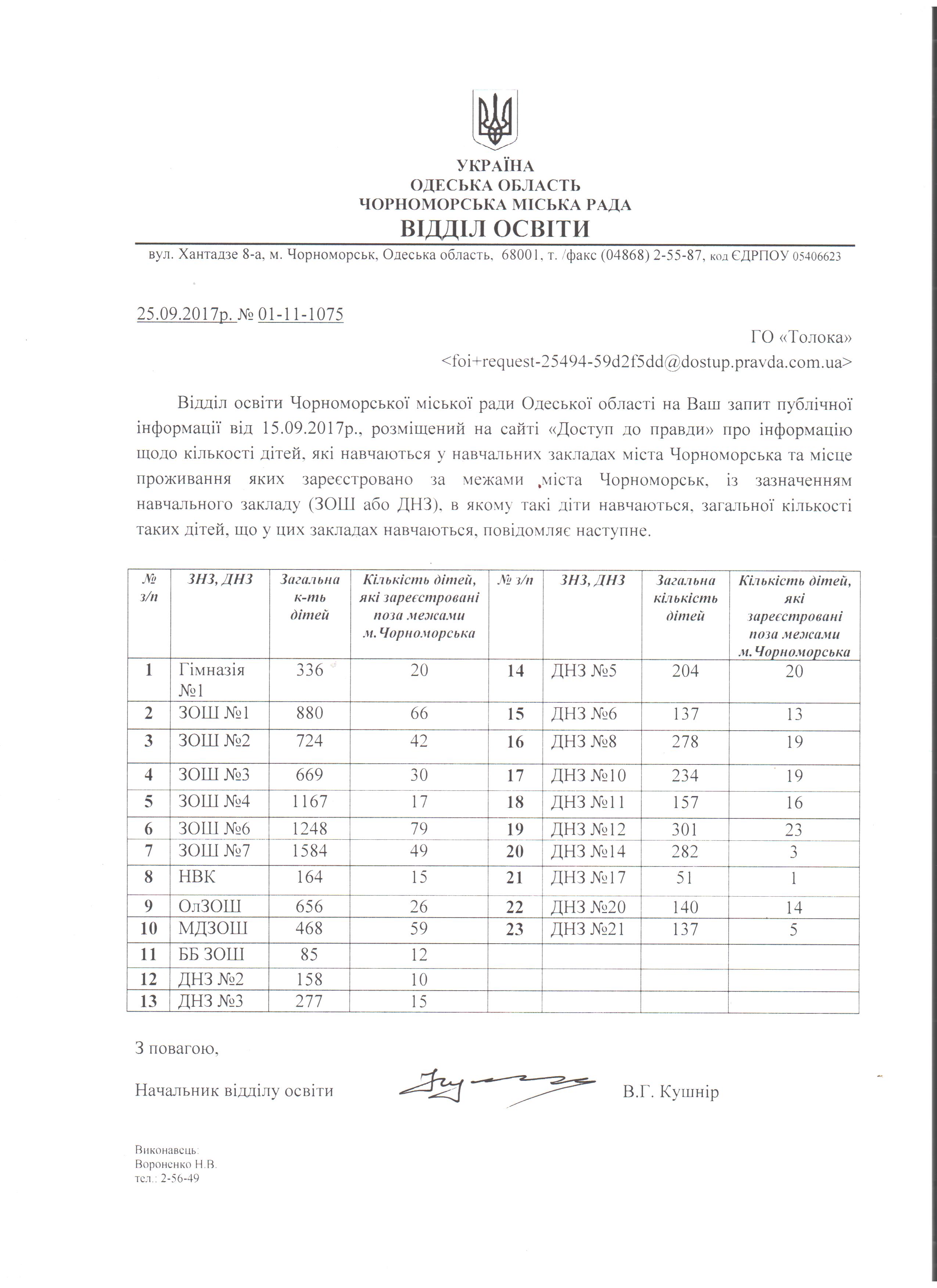 - про кількість дітей, які навчаються у навчальних закладах міста Чорноморська та місце проживання яких зареєстровано за межами міста Чорноморська, із зазначенням навчального закладу (ЗОШ або ДНЗ), в якому такі діти навчаються, загальної кількості таких дітей, що у цих закладах навчаються; та зазначенням кількості таких дітей відповідної вікової категорії (група ДНЗ або відповідний клас відповідної школи)