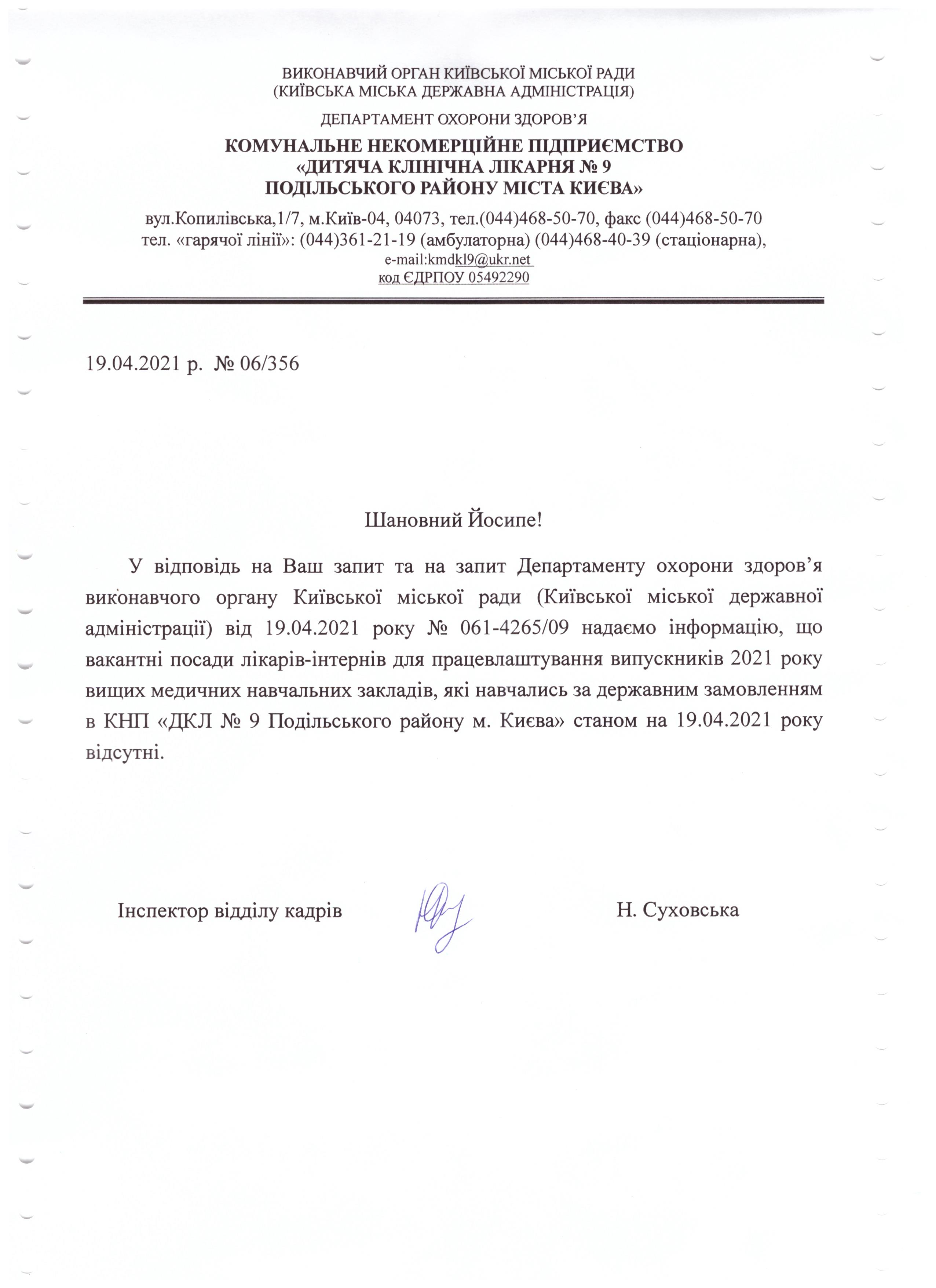 на виконання листа від 19.04.2021 № 061-4265/09 про надання інформації