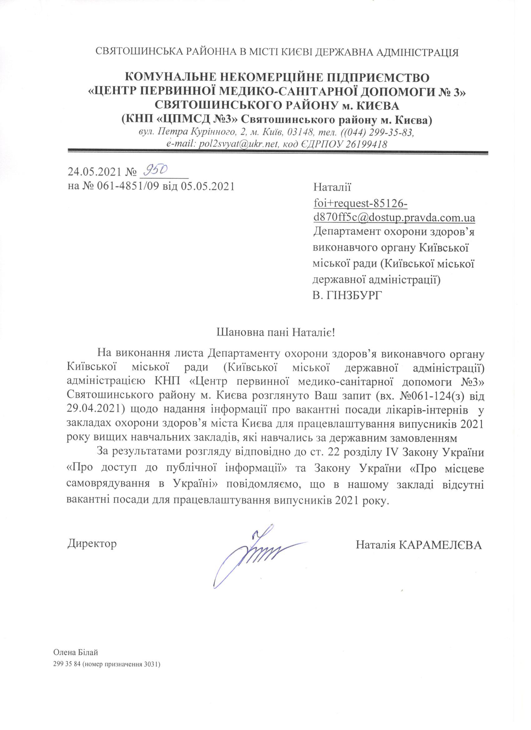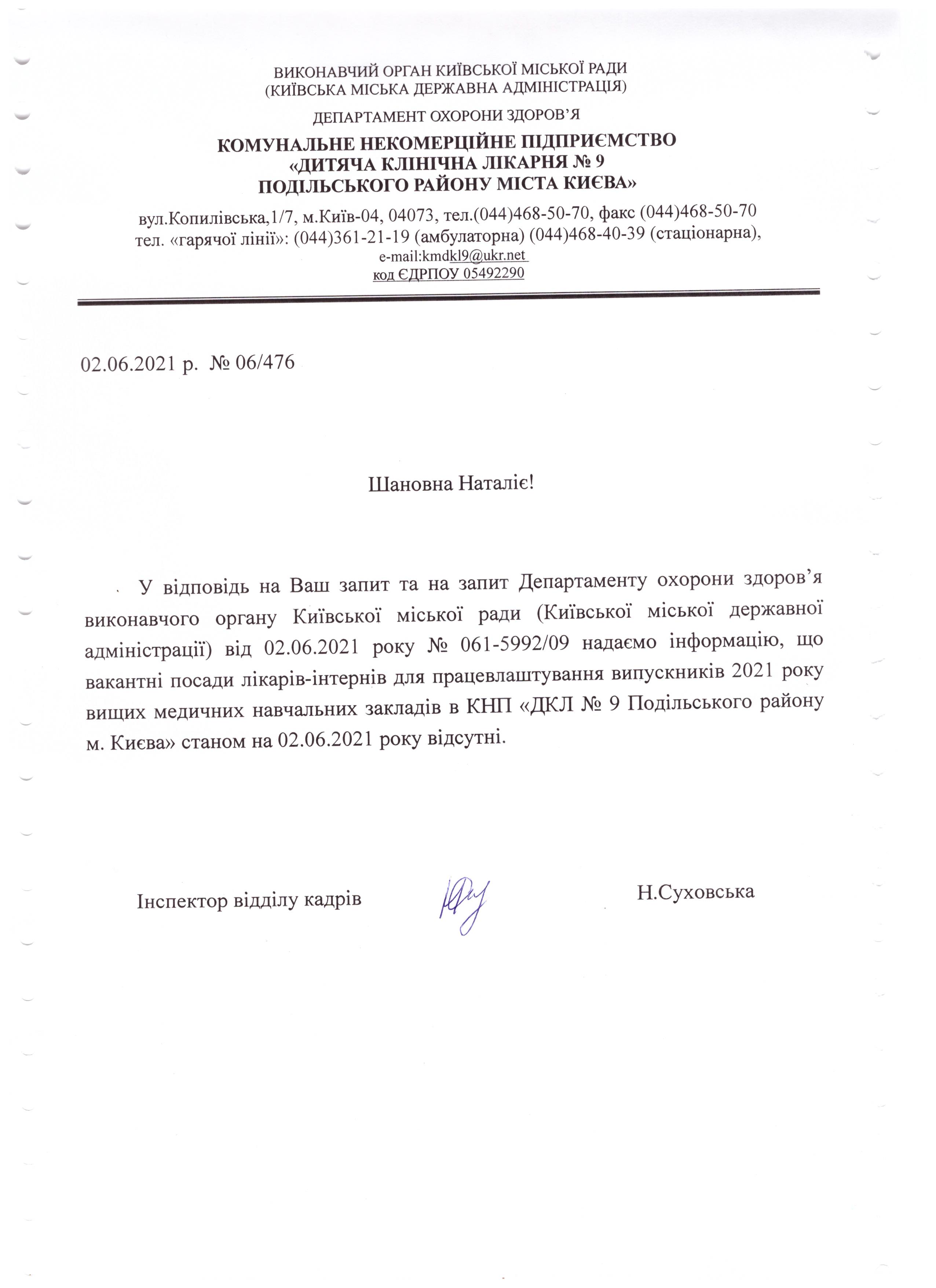 станом на 03.06.2021 у закладі відсутні вакантні посади лікарів-інтернів.