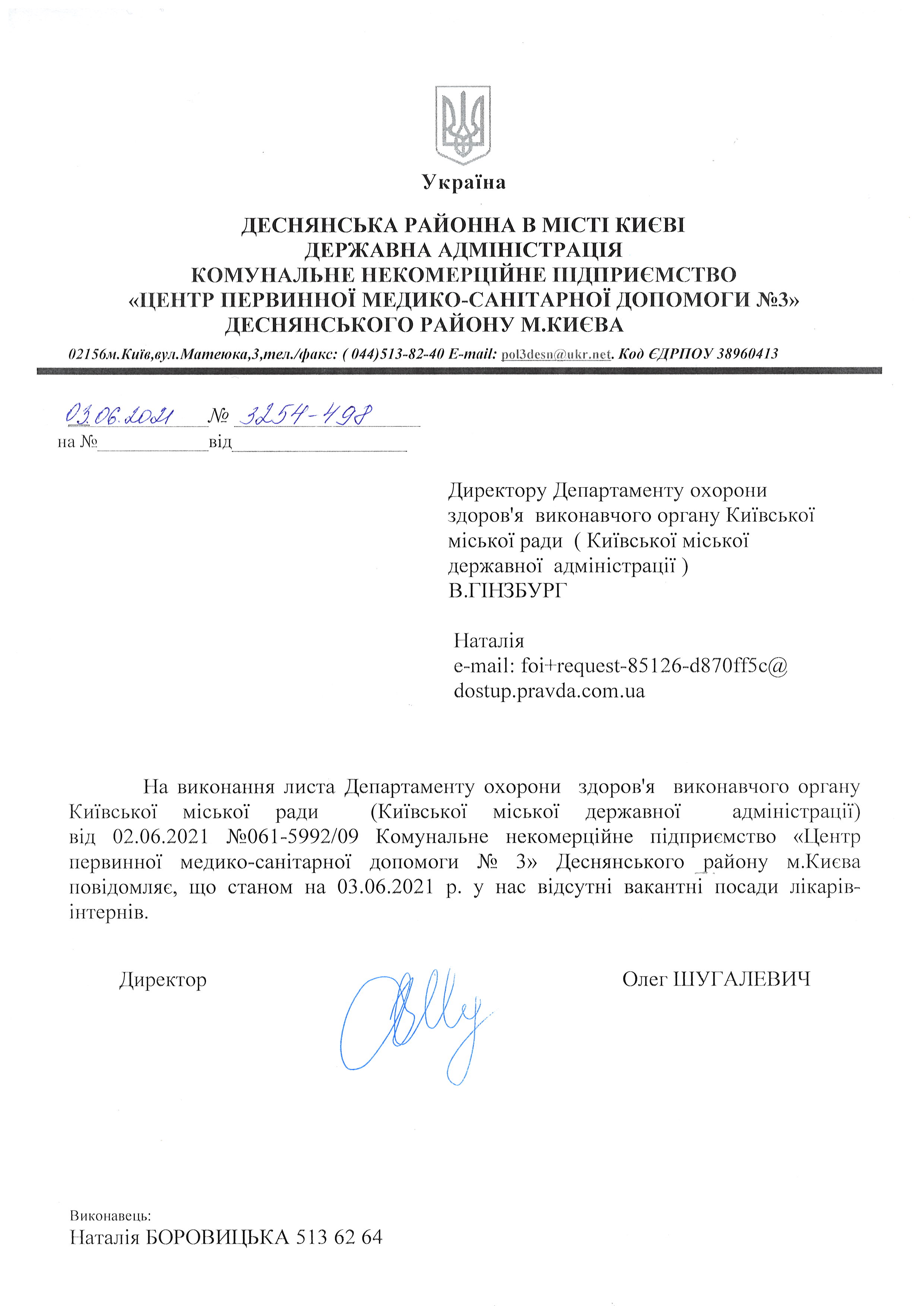 Адміністрація КНП ЦПМСД № 3 Дарницького району м. Києва повідомляє, що