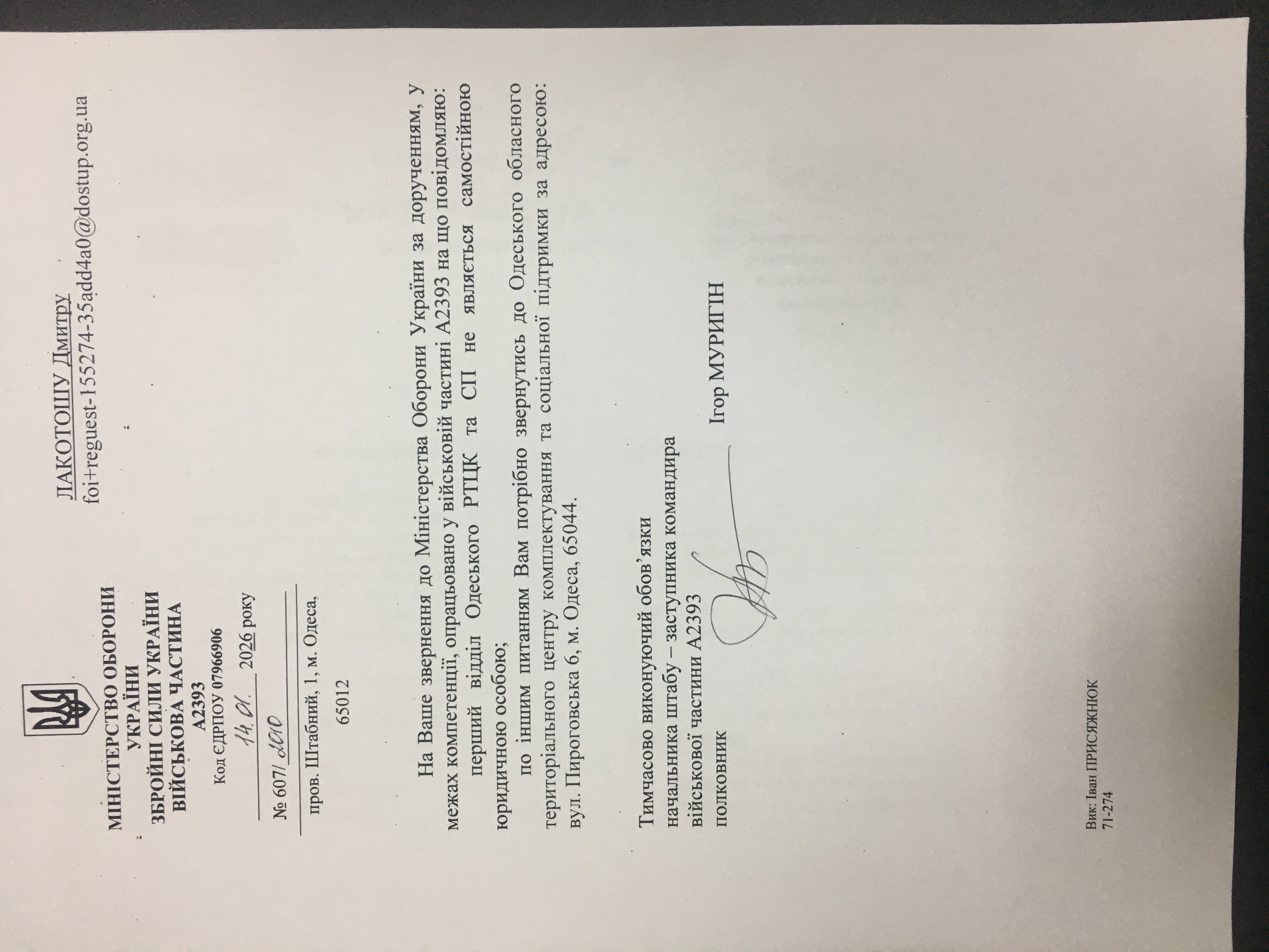 Власний код ЄДРПОУ Першого відділу Одеського РТЦК та СП, а також інформацію щодо діяльності як самостійної юридичної особи та інформацію стосовно підпорядкованості Одеському ОТЦК та СП.