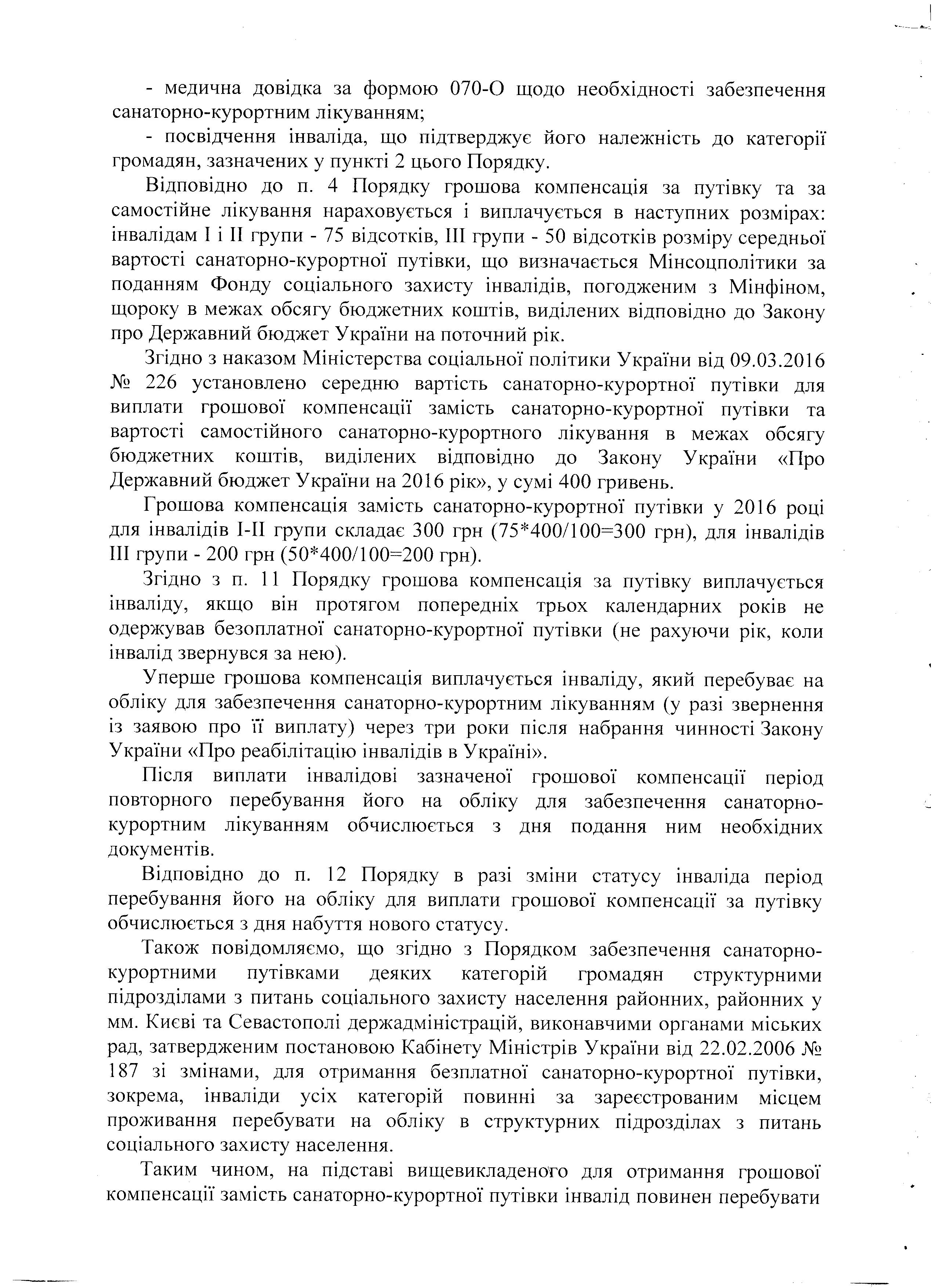 Компенсація за санаторно-курортне лікування інваліда
