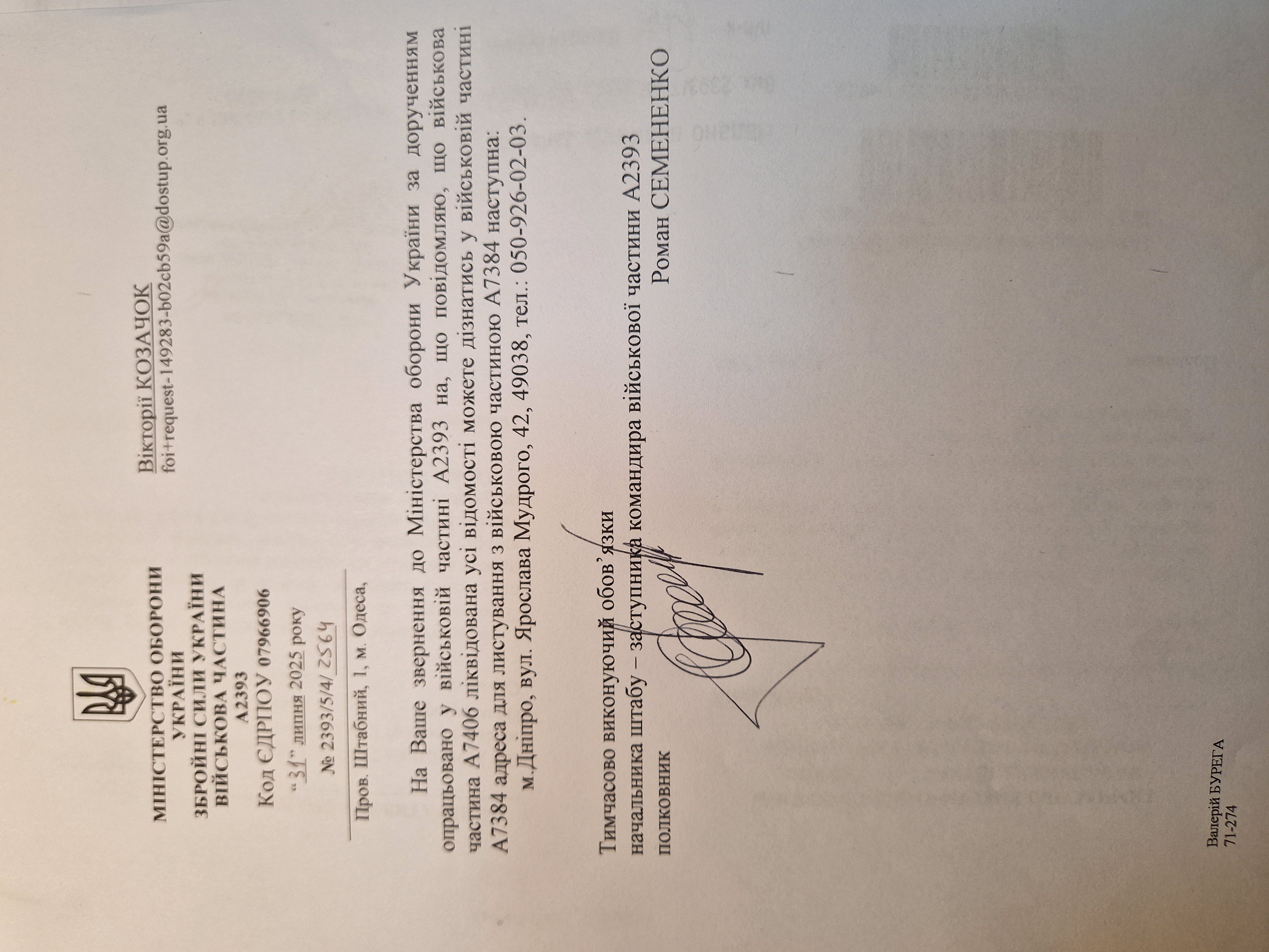 Мені потрібна контактна інформація В/Ч А-7406 (контактний телефон, електрона почта)