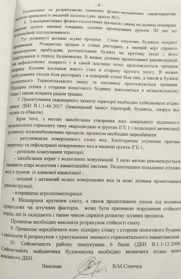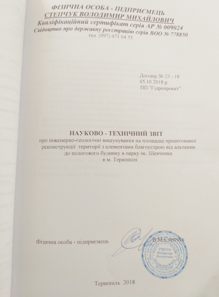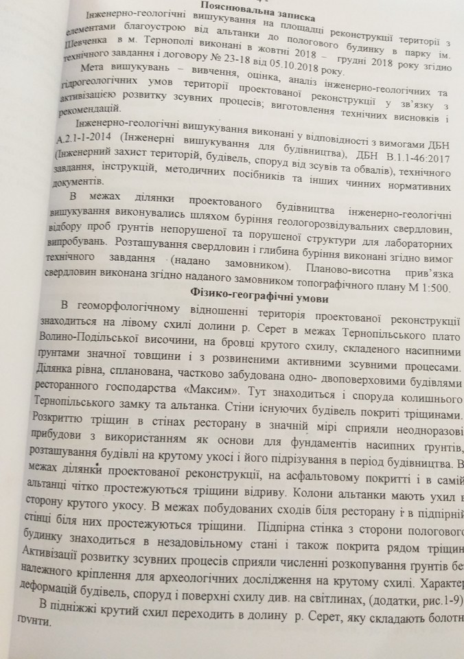 На підставі статей 1, 13, 19, 20 Закону України «Про доступ до публічної інформації» від 13 січня 2011 року, які надають право звертатись із запитами до розпорядників інформації щодо надання публічної інформації, прошу надати копію експертизи та офіційного висновку фахівців по зсуву грунту на місці старої альтанки, яка розміщена неподалік Тернопільського замку та скверу Яна Амора Тарнавського.