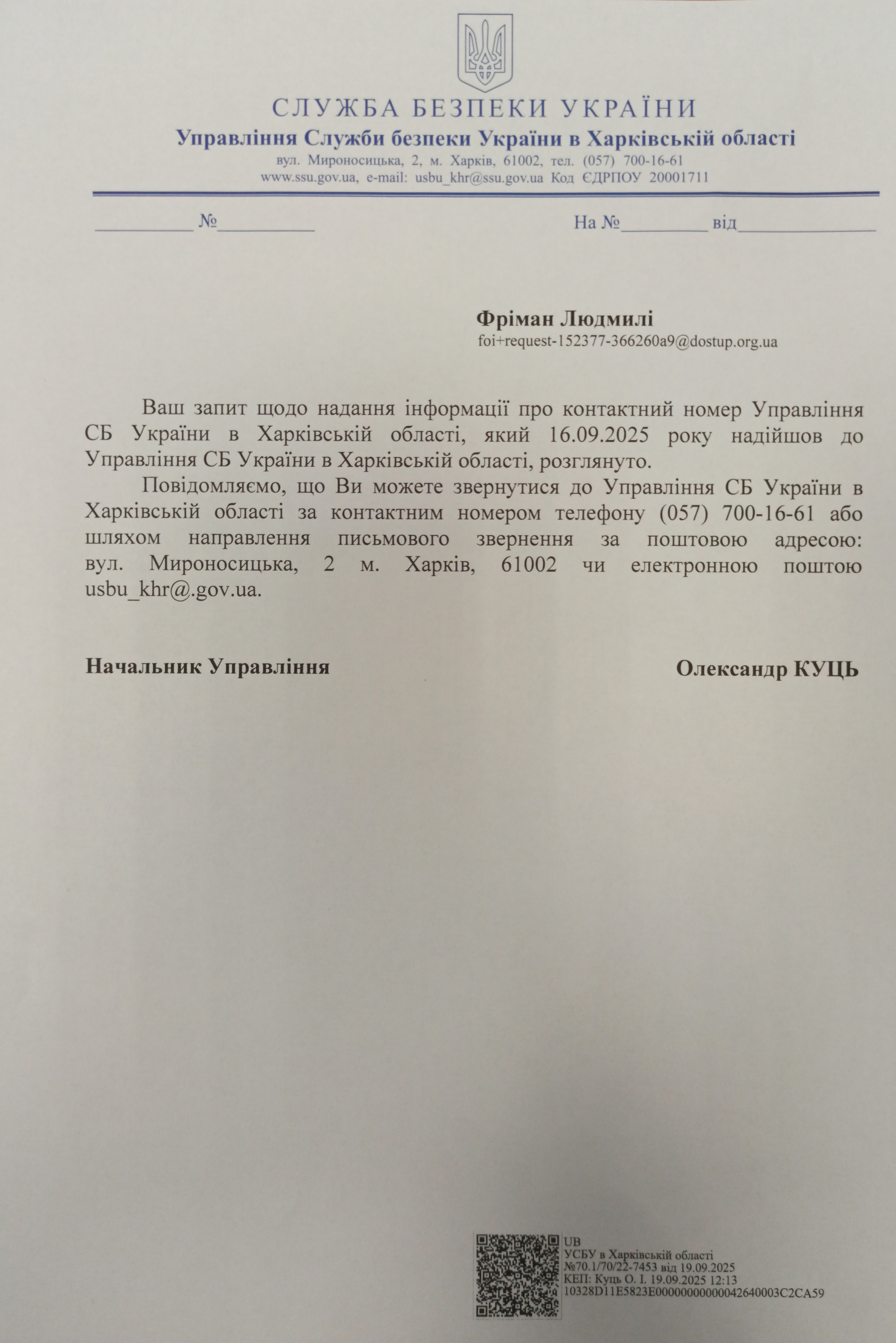 Надайте офіційний номер телефона приймальні Начальника управління служби безпеки України в Харківській області. Хто на даний момент Начальник управління служби безпеки України в Харківській області?