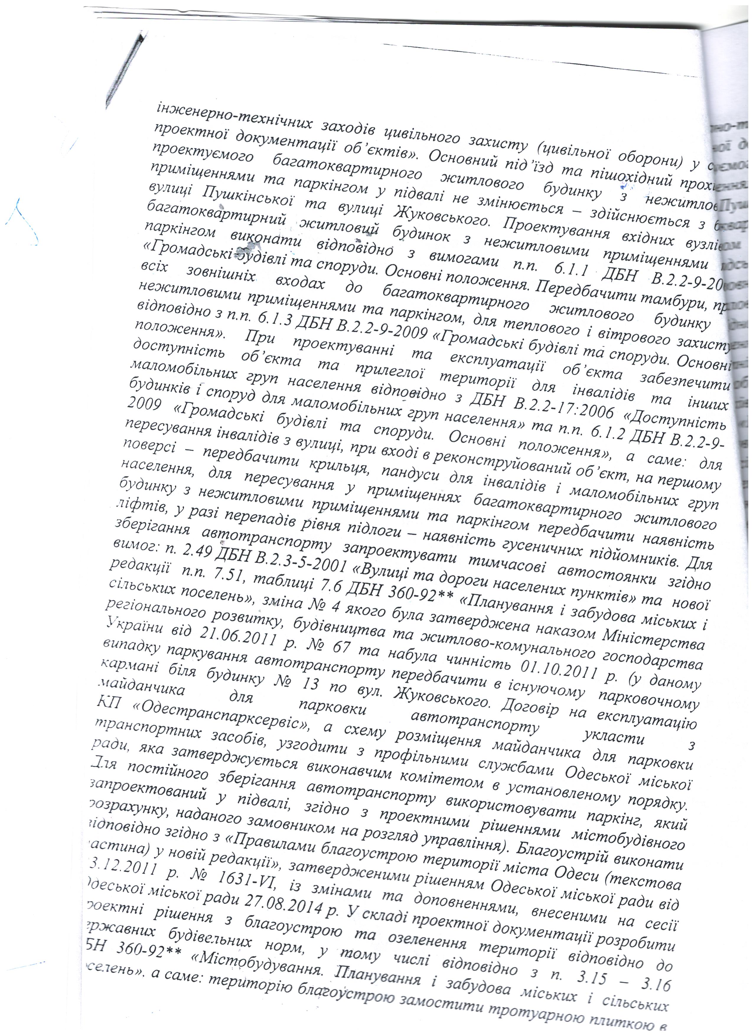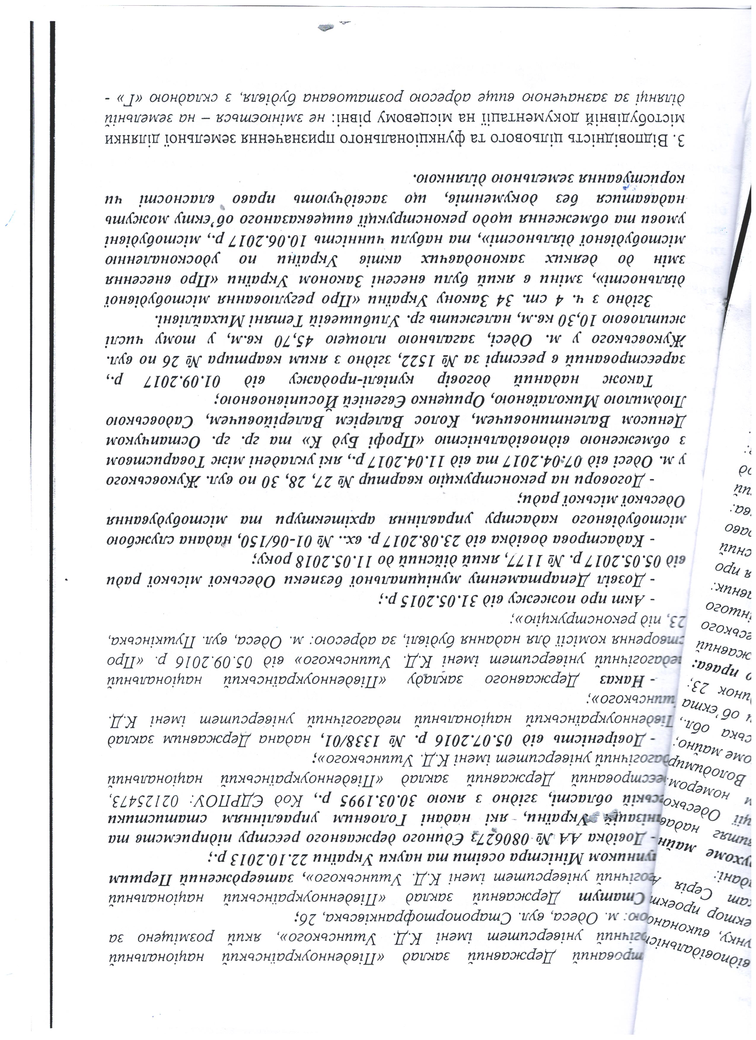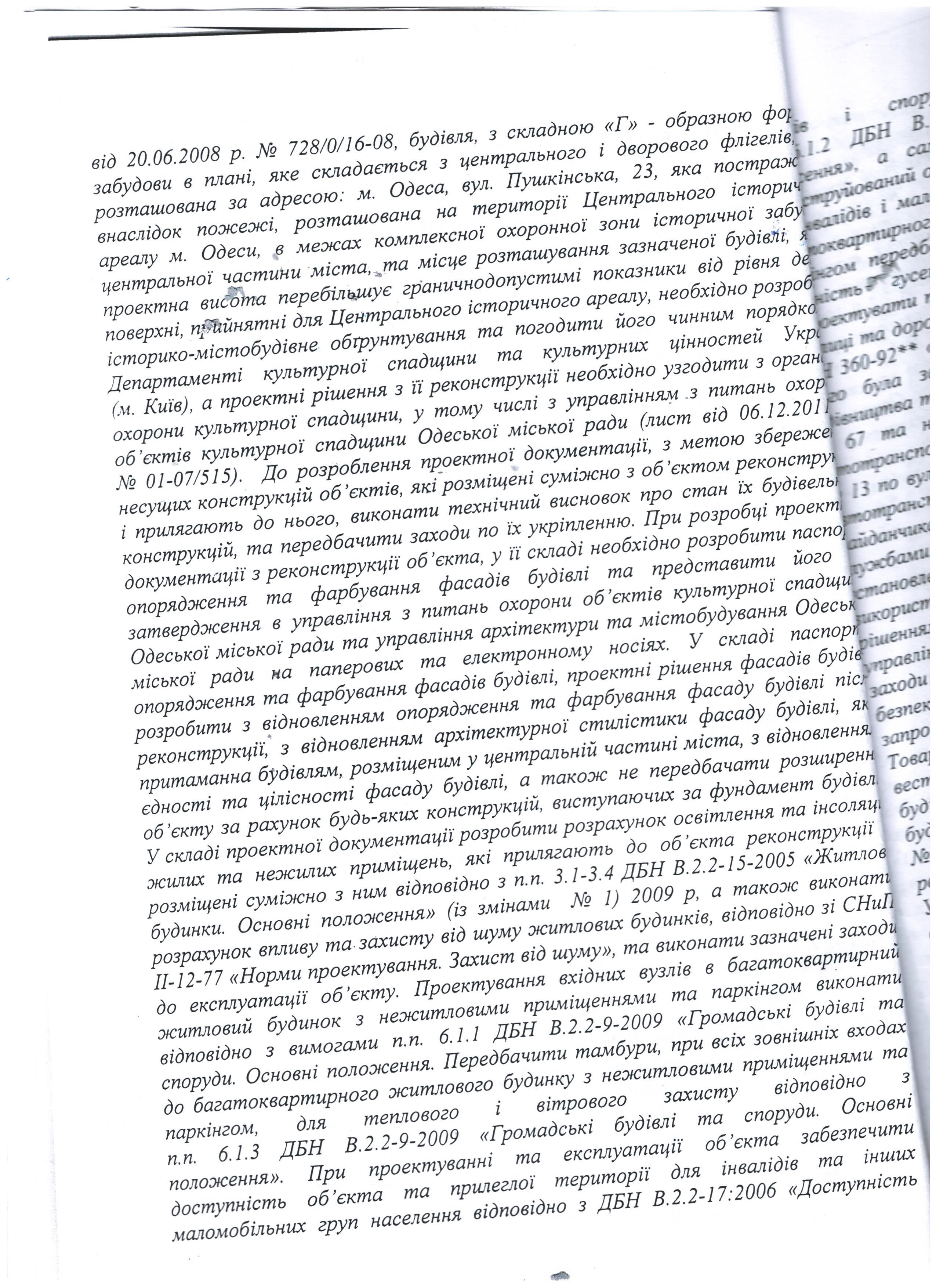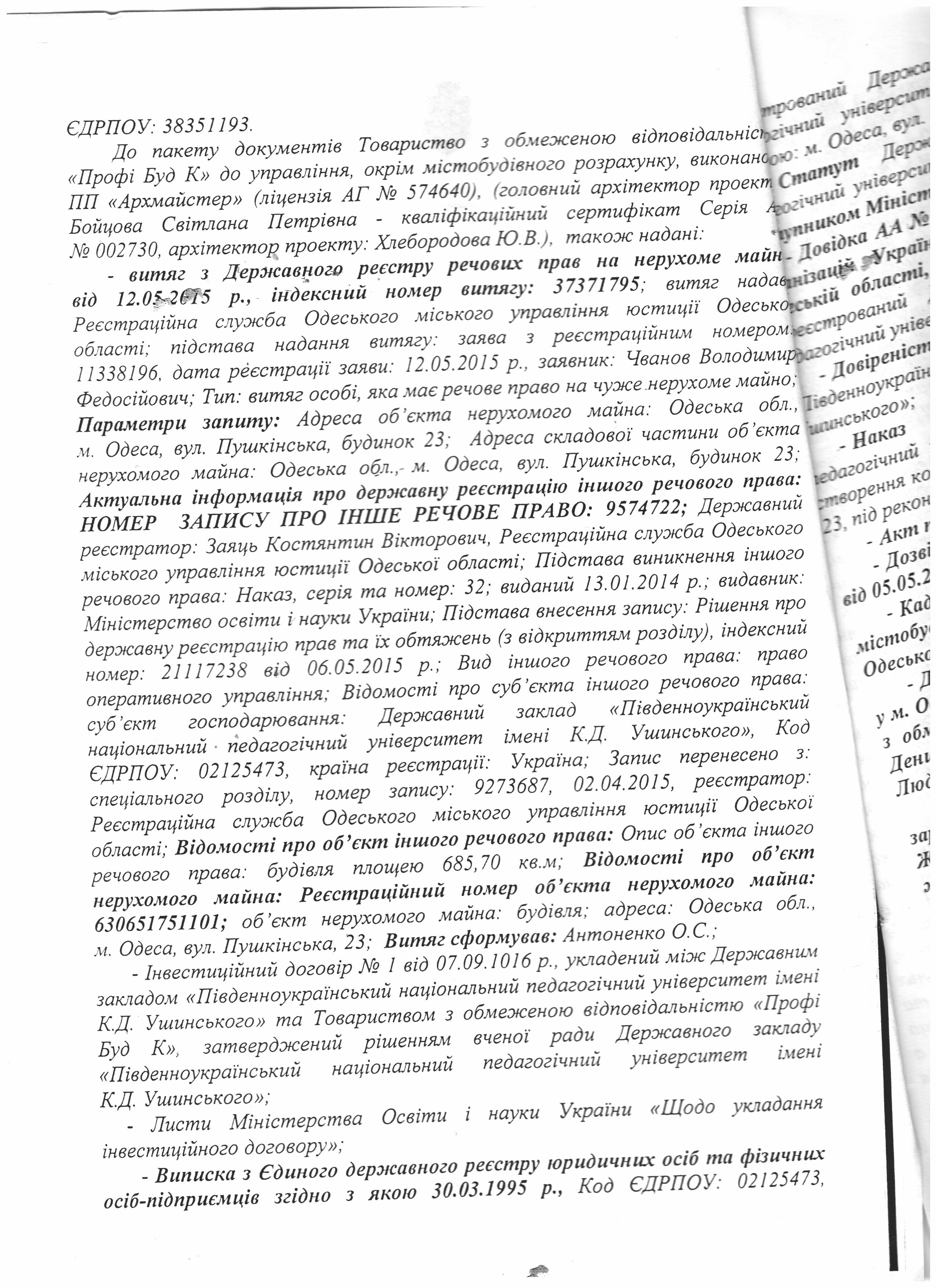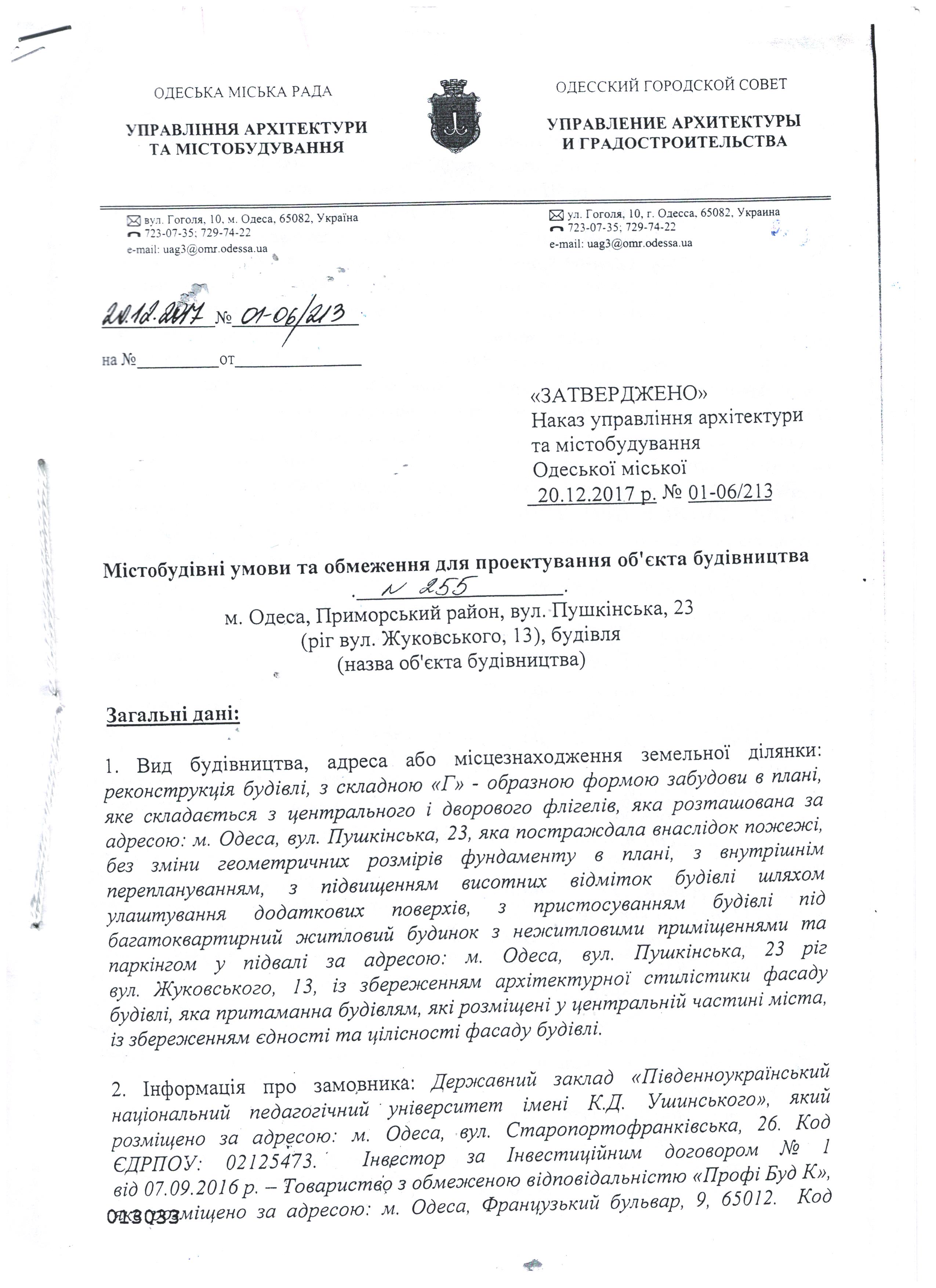 1) Належним чином завірену копію Містобудівних умов та обмежень на проектування будівництва (реконструкції) нежитлового будинку за адресою м. Одеса, вул. Пушкінська, 23, що здійснюється на замовлення ДЗ "Південноукраїнський національний педагогічний університет ім. К.Д. Ушинського".