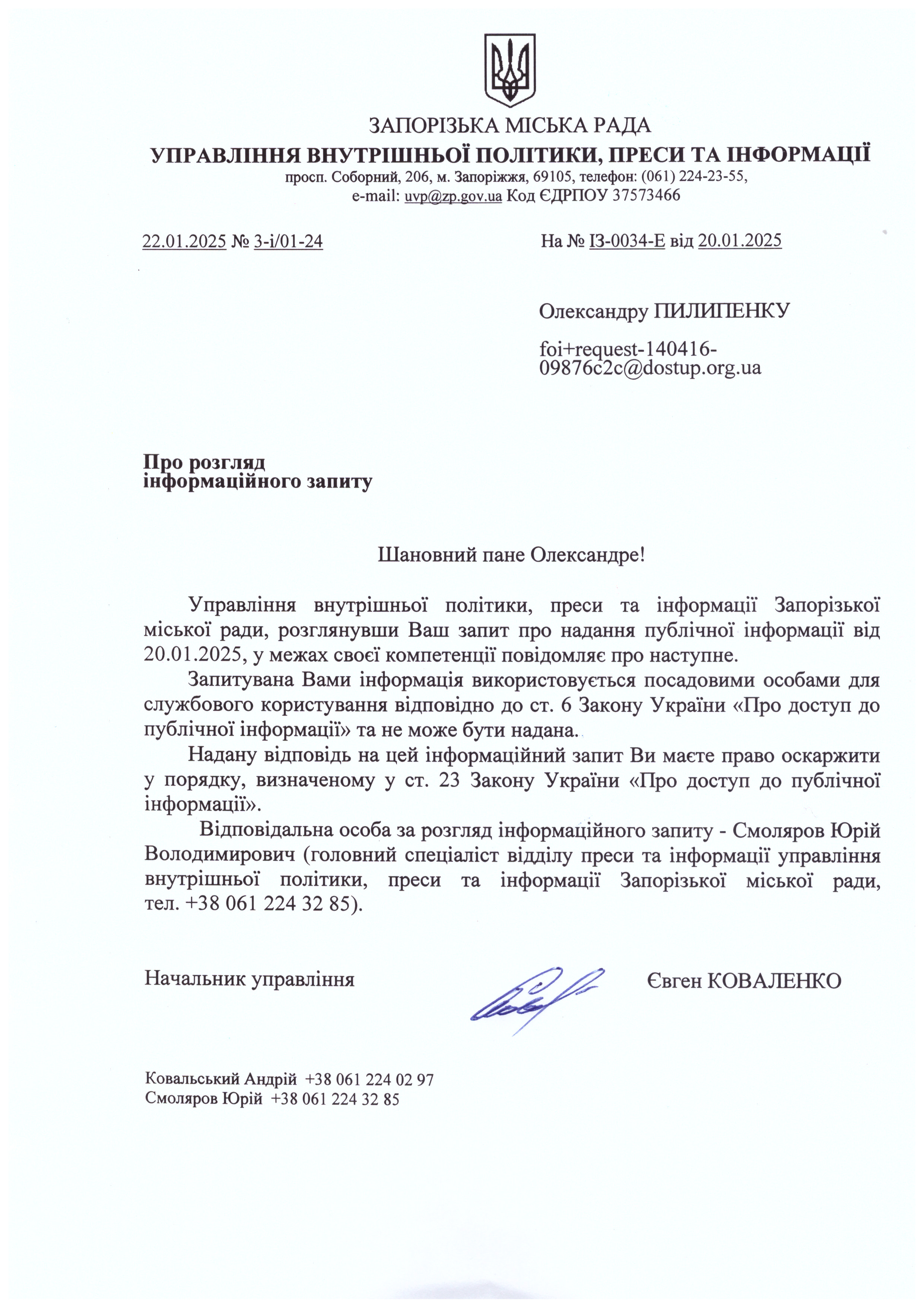 На підставі статей 1, 13, 19, 20 Закону України «Про доступ до публічної інформації» від 13 січня 2011 року, прошу надати результати послуг по збору та аналізу даних у засобах масової інформації, які у 2024 році на замовлення виконавчого комітету Запорізької міської ради проводило ТОВ "ЛУК МЕДІА УКРАЇНА" вартістю 99 996,00 грн (копію звіту та інших створених у процесі моніторингу документів).