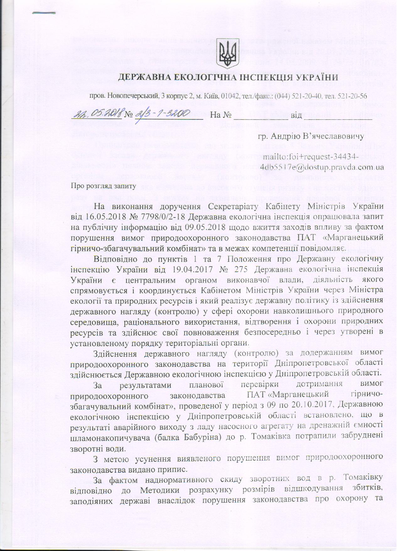 Прошу надати інформацію чи притягувався ПАТ «Марганецький гірничо-збагачувальний комбінат» (Код ЄДРПОУ: 00190911) до відповідальності за забруднення поверхневих вод річки Томаківка, через скид у неї стічних (зворотних) вод із забруднюючими речовинами. Та надати копії документів.