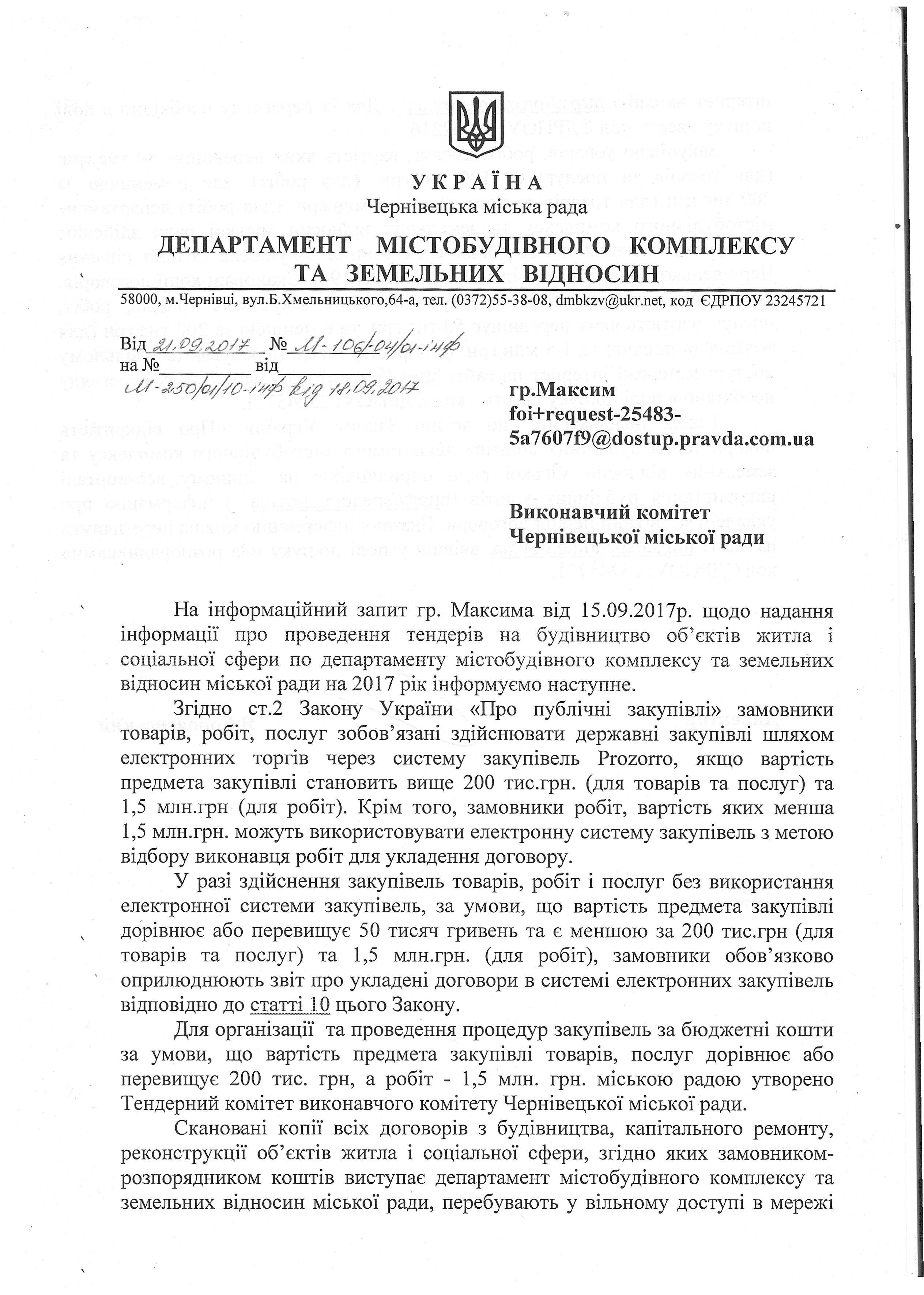 1. Чи проводилися тендери на будівництво об'єктів житла і соціальної сфери по департаменту містобудівного комплексу та земельних відносин міської ради на 2017 рік?
