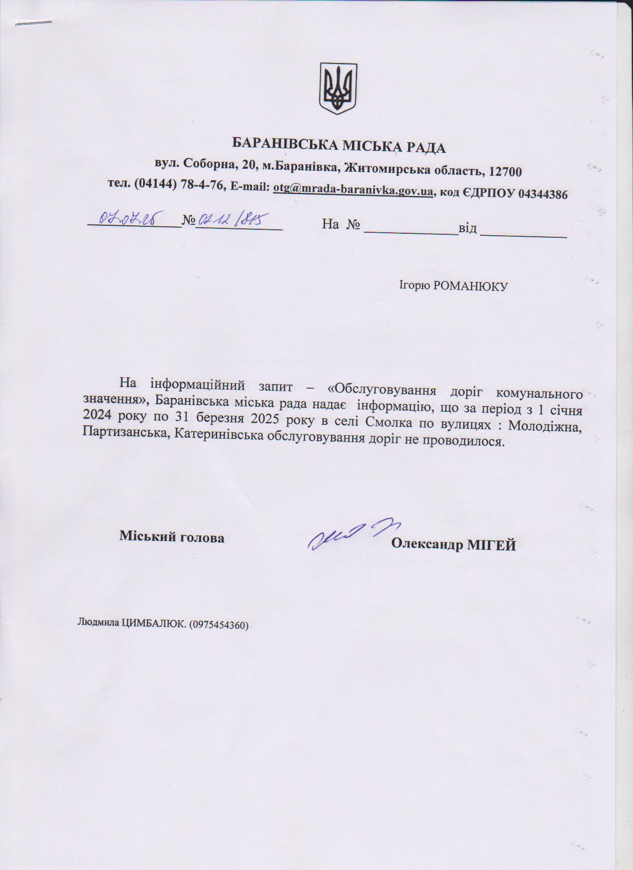 Перелік документів і їх копії: постанов, наказів, договорів, рішень сесій, згідно з якими проводилось обслуговування доріг в селі Смолка по вулицях: Молодіжна, Партизанська, Катеринівська.