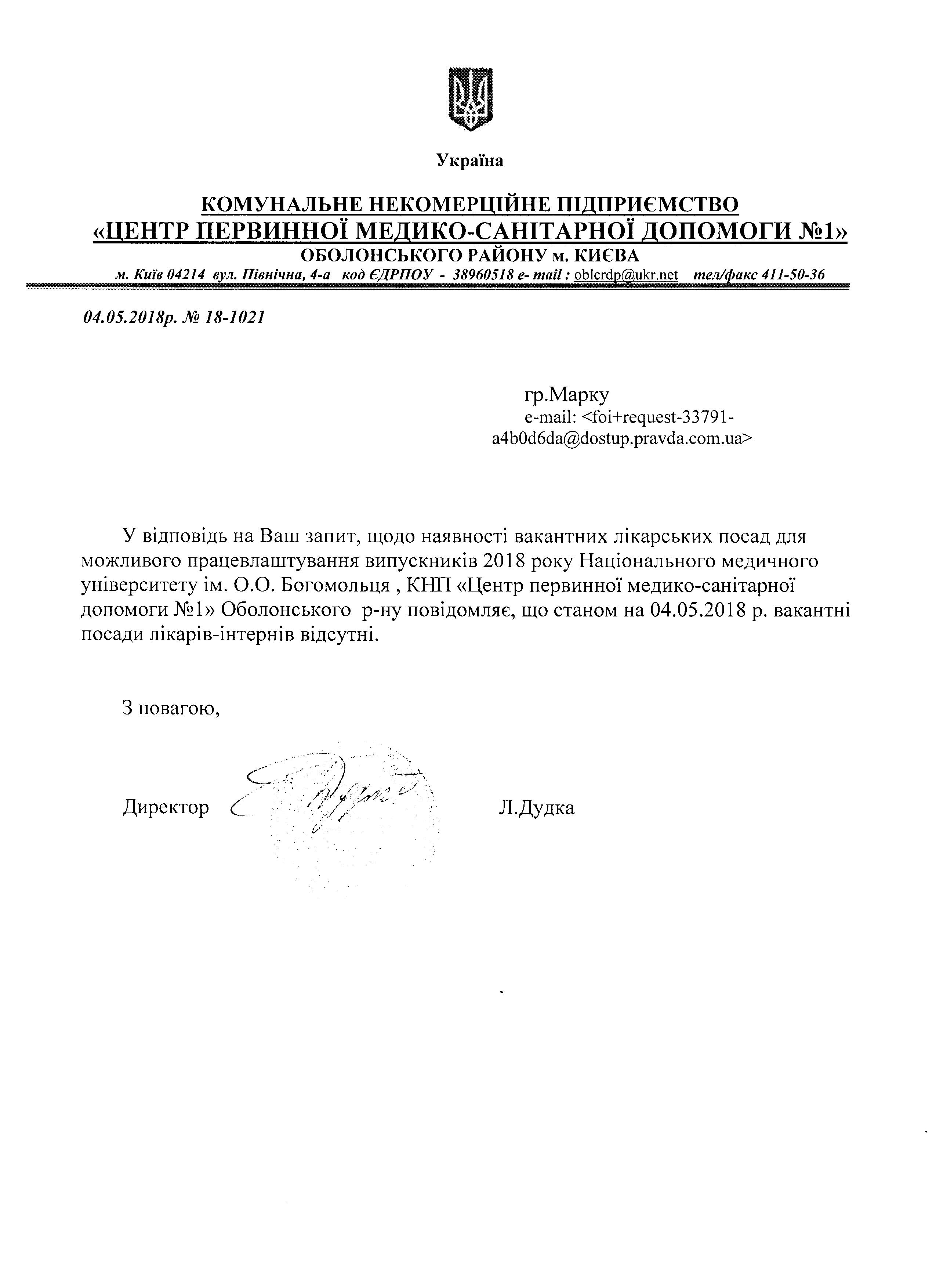 На підставі статей 1, 13, 19, 20 Закону України «Про доступ до публічної інформації» від 13 січня 2011 року, які надають право звертатись із запитами до розпорядників інформації щодо надання публічної інформації, прошу надати наступну інформацію (наступні документи):повний перелік вакансій для випускників НМУ ім. О.О. Богомольця бюджетної форми навчання для проходження інтернатури в усіх установах (поліклінік, лікарень, науково-дослідних інститутів тощо), що перебувають у підпорядкуванні Департаменту охорони здоров'я та Міністерства охорони здоров'я в місті Києві та Київській області станом на момент мого звернення - 19 квітня 2018 року.