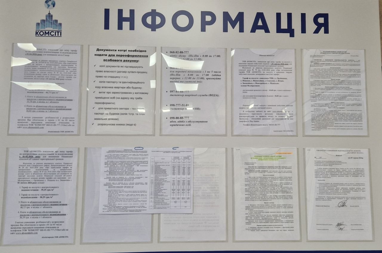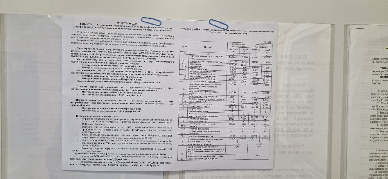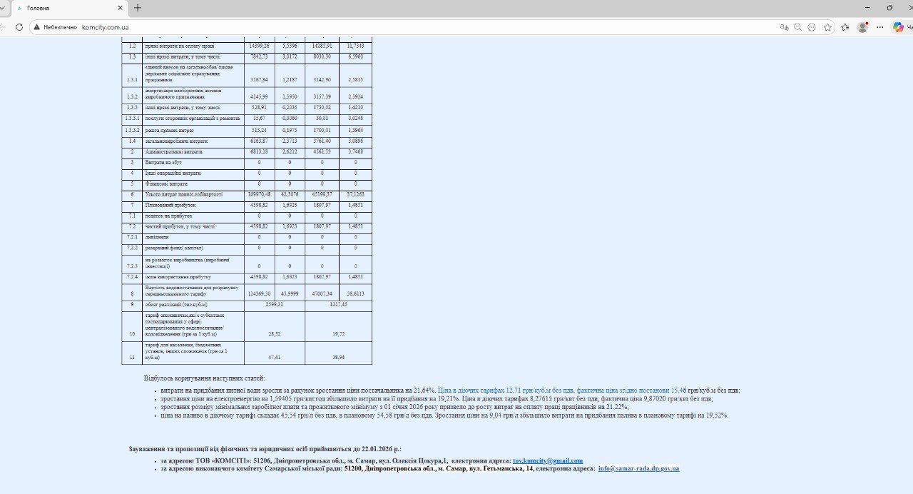 Прошу надати повний перелік ресурсів, друкованих засобів масової інформації, інтернет- видань у соціальних мережах міста тощо, на яких органами місцевого самоврядування м. Самар до споживачів було доведено інформацію про намір змінити тариф на централізоване водопостачання з позначенням адреси, за якою приймаються зауваження і пропозиції, а також строку приймання таких зауважень і пропозицій. А також інших способів доведення до відома споживачів цієї інформації, якщо вони були застосовані.
