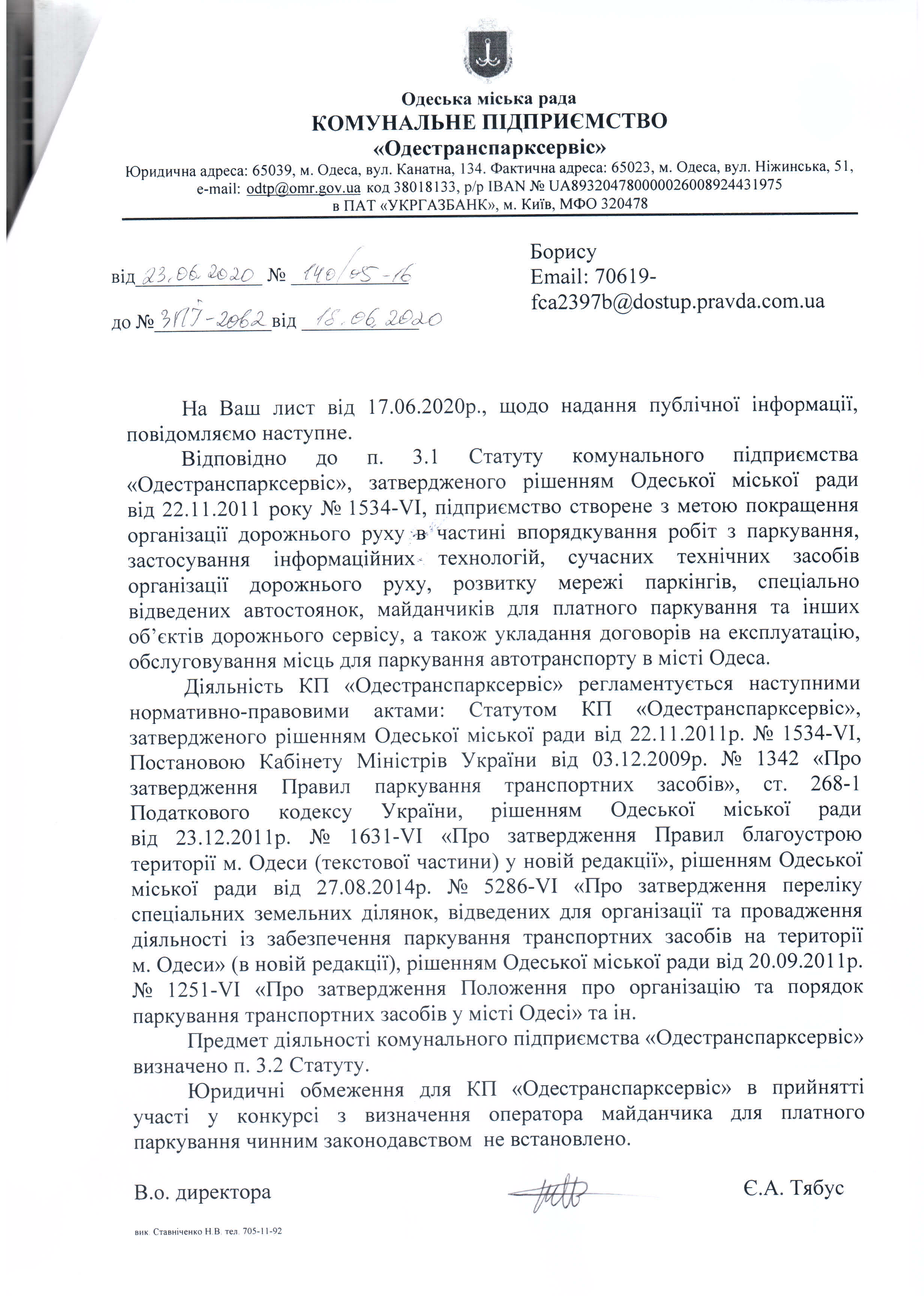 1. На яких підставах КП «Одестранспарксервіс» може бути визначено оператором майданчика для платного паркування (організовувати та провадити діяльність із забезпечення паркування транспортних засобів на майданчиках для платного паркування)?