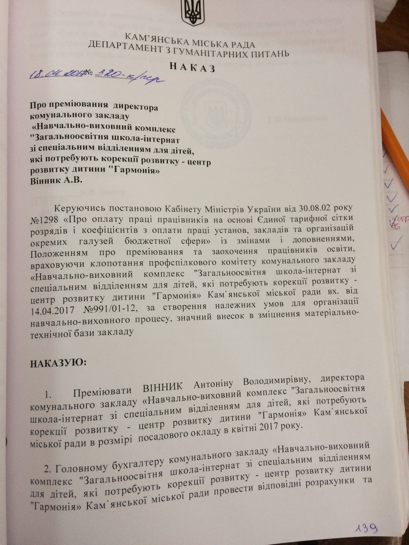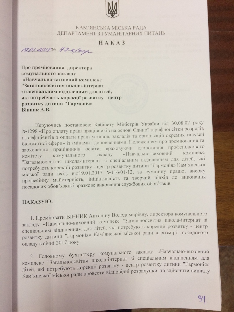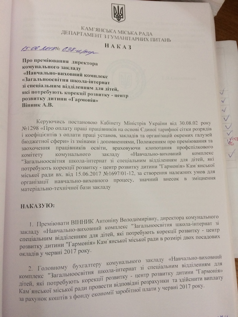 1) Скан-копії наказів "Про преміювання директора НВК "Гармонія" м. Кам'янське" з вказанням району, № навчального закладу, прізвища керівника та розміра щорічної премії за 2017 та 2018 роки.