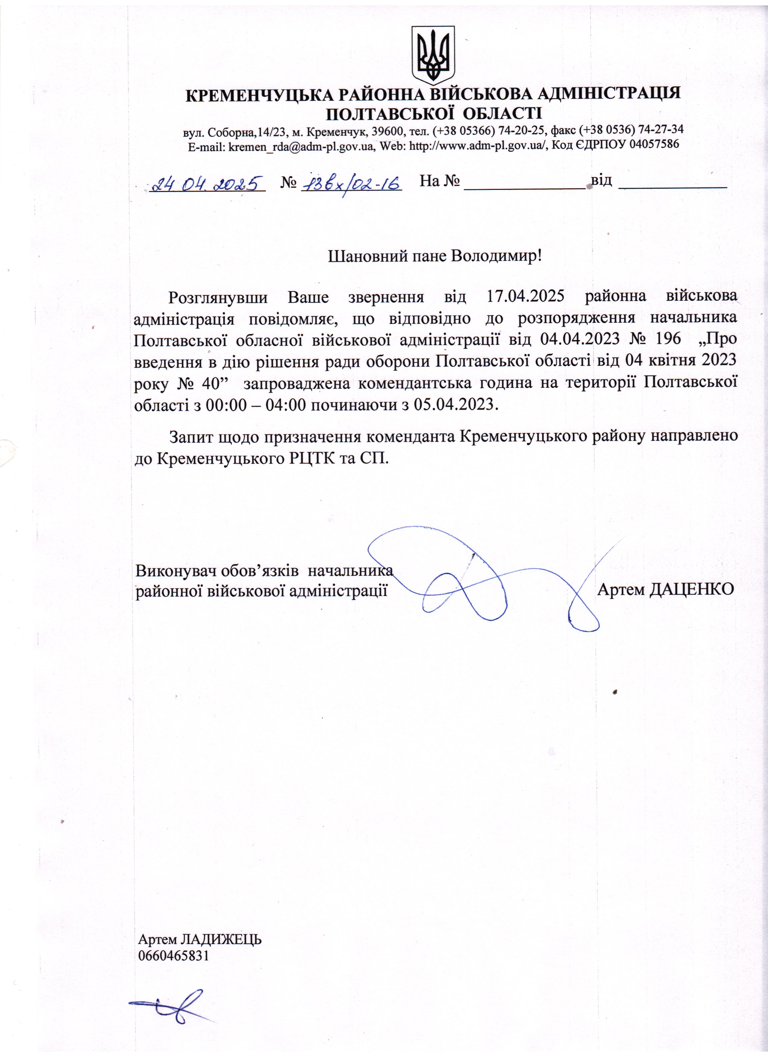 Згідно закону України про правовий режим воєнного стану,прошу надати мені інформацію про те чи призначено коменданта в Кременчуцькому районі та копію документа про дію комендантської години на тереторії Кременчуцького району