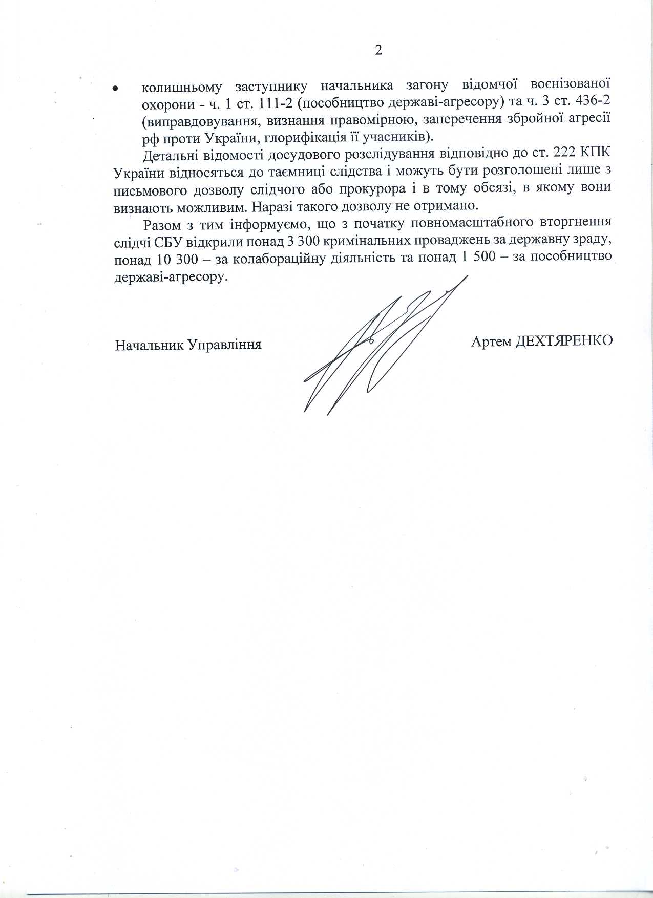 У заявку з цим, просимо інформувати, чи наявні у провадженні СБУ кримінальні справи за фактом підписання контрактів співробітниками ЗАЕС з "Росатомом", за фактом співпраці українських атомників з окупаційною владою? Якщо так, то скільки таких проваджень, якої кількості осіб вони стосуються, як кваліфіковані? Чи оголошені в межах таких провадження повідомлення про підозру?