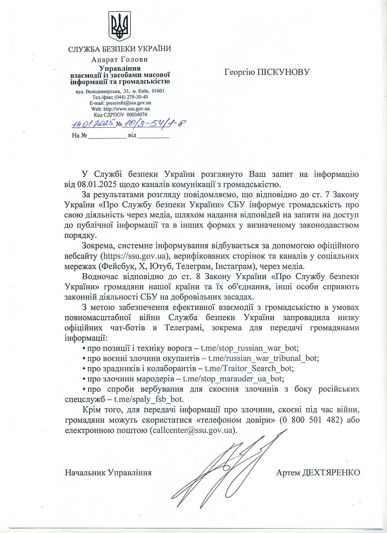 Надати перелік вебсайтів, телефонів довіри, телеграм-ботів, акаунтів у інших інтернет-месенджерах чи соціальних мережах що використовувались Службою шляхом оприлюднення з метою залучення до конфіденційного співробітництва громадян України, іноземних громадян або осіб без громадянства задля збору інформації про переміщення ворога на тимчасово окупованих територіях України, на окупованих Україною територіях Російської Федерації у її міжнародно визнаних кордонах як держави-агресора, а також на інших територіях, в тім числі поза міжнародно визнаних кордонів України та Російської Федерації як суб’єктів міжнародного права.