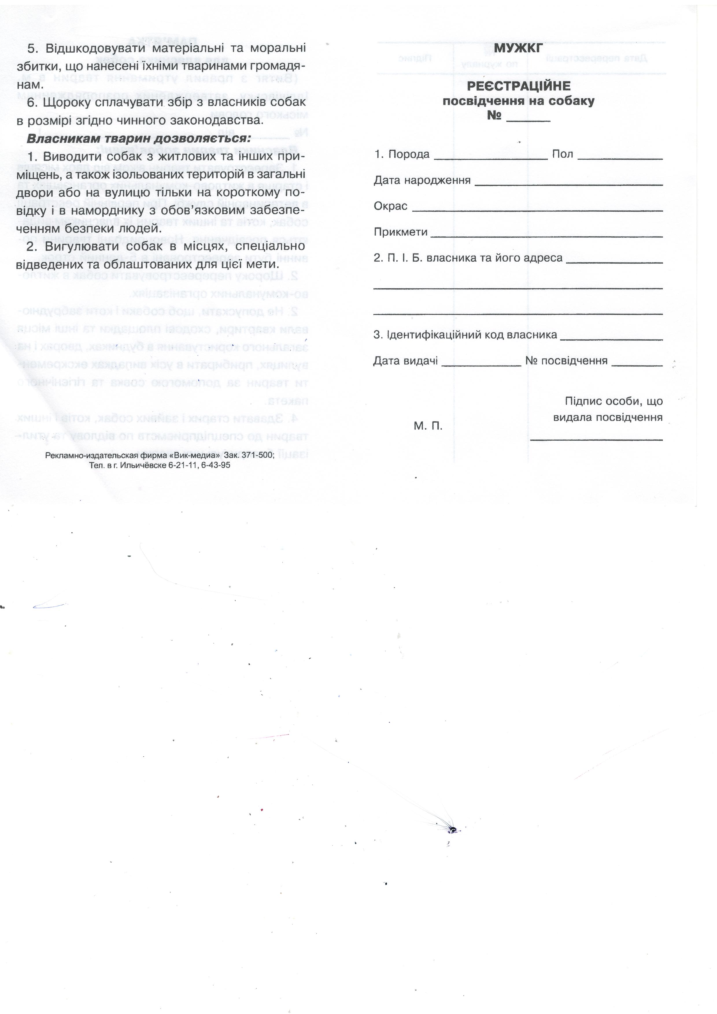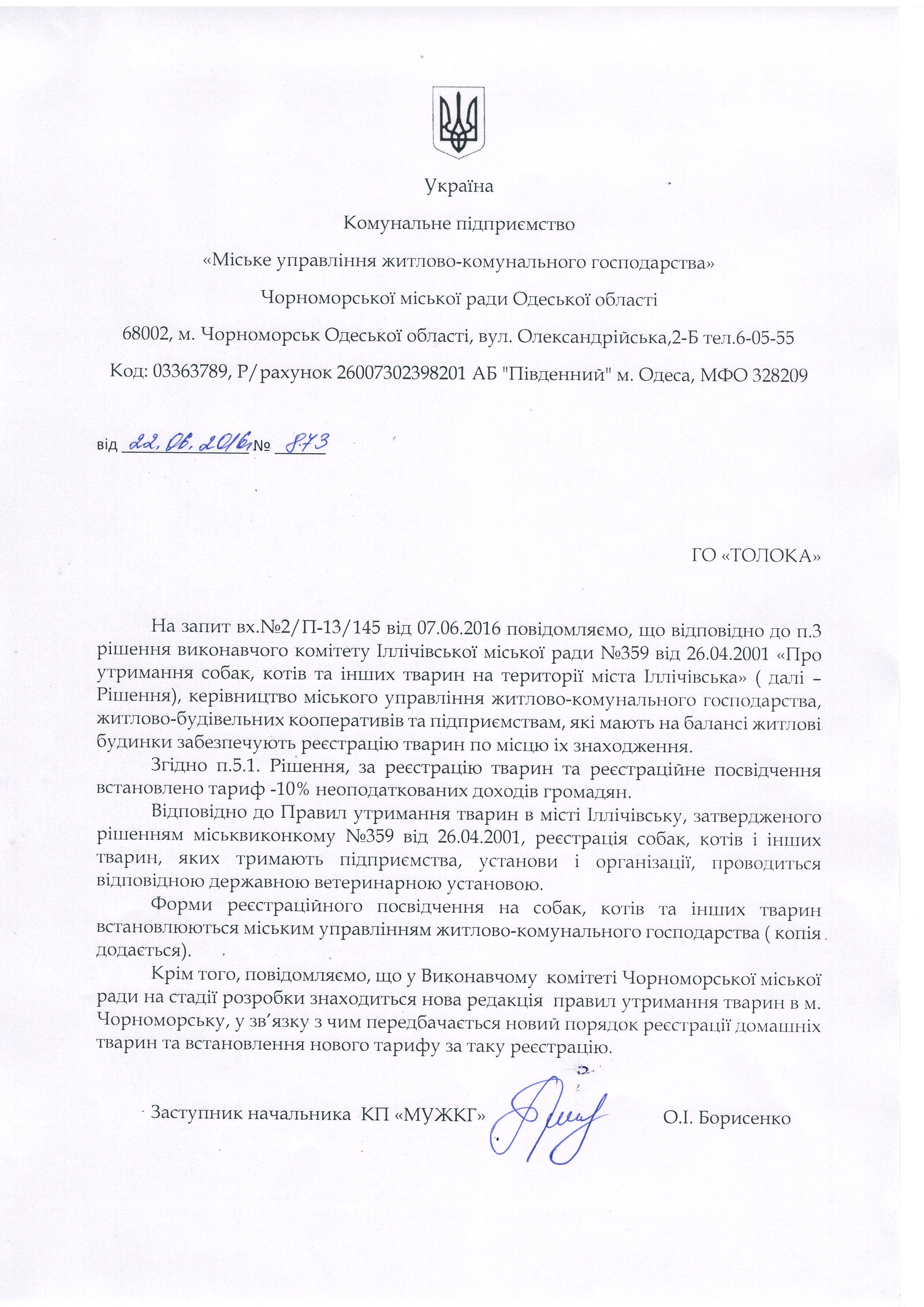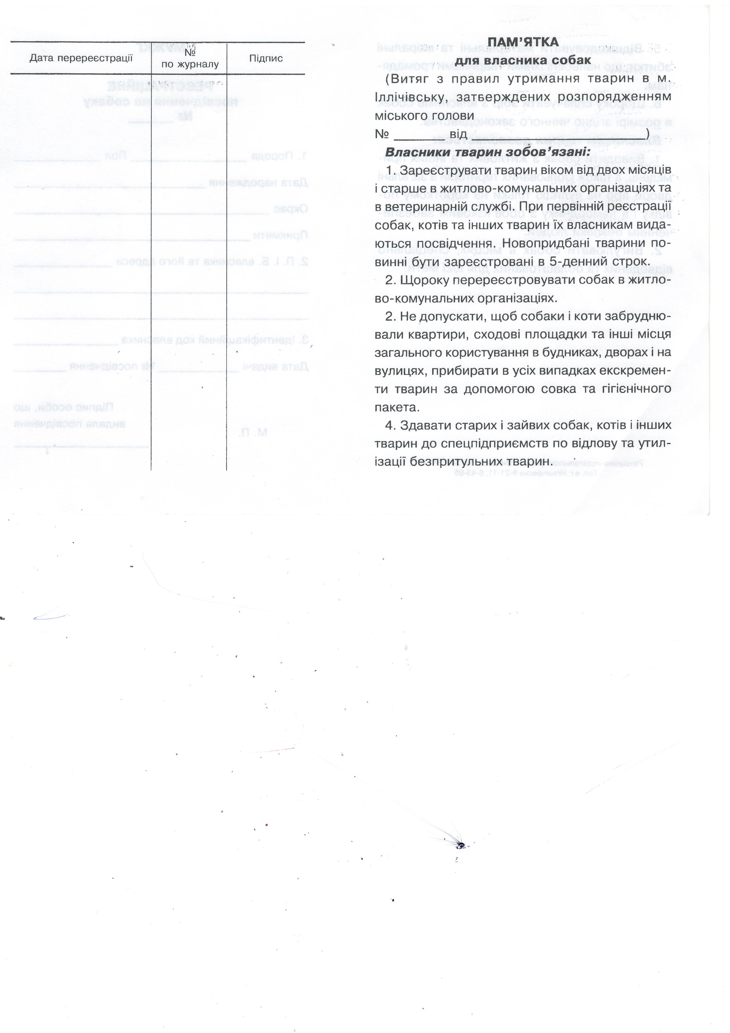 про житлово-комунальні організації та ветеринарні служби (пункти реєстрації), які здійснюють первинну реєстрацію придбаних тварин відповідно до Правил утримання тварин у м. Іллічівську, затверджених рішенням міськвиконкому № 359 від 26.04.2001року, та Правил тримання собак, котів і хижих тварин у населених пунктах Української РСР, від 17.06.1980р., щорічну перереєстрацію тварин, а саме: назву такої організації (пункту реєстрації), місце та часи прийому документів на реєстрацію тварин, поточну вартість послуг із реєстрації \перереєстрації;