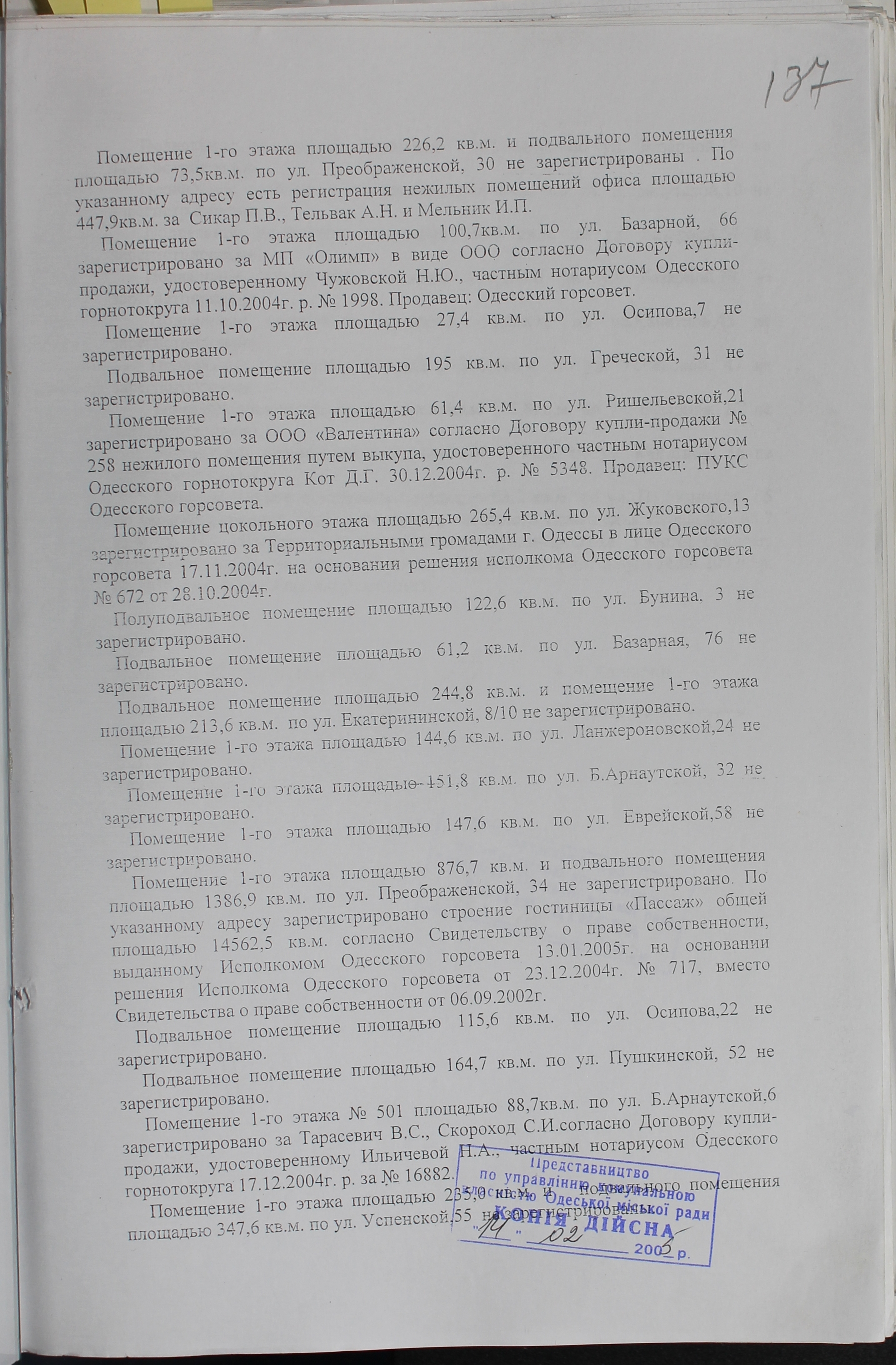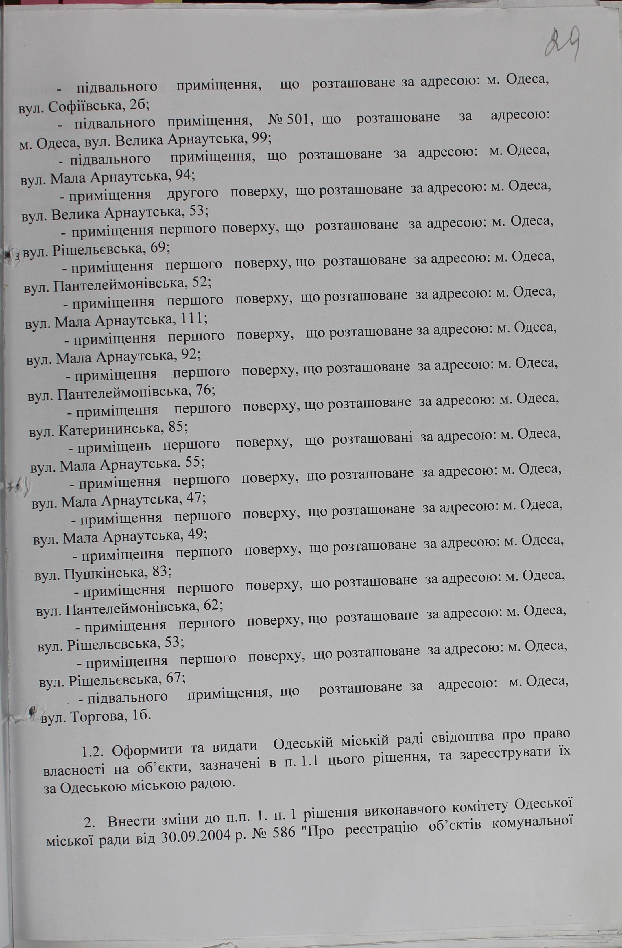 Відповідно до рекомендації департаменту архивної справи № 2594-11.1-38зпи прошу надати сканкопії сторінок додатку до рішення виконавчого комітету Одеської міської ради від 10.03.2005р. № 123 «Про реєстрацію об’єктів комунальної власності м. Одеси», які стосуються адреси будинку: Катерининська , 69.