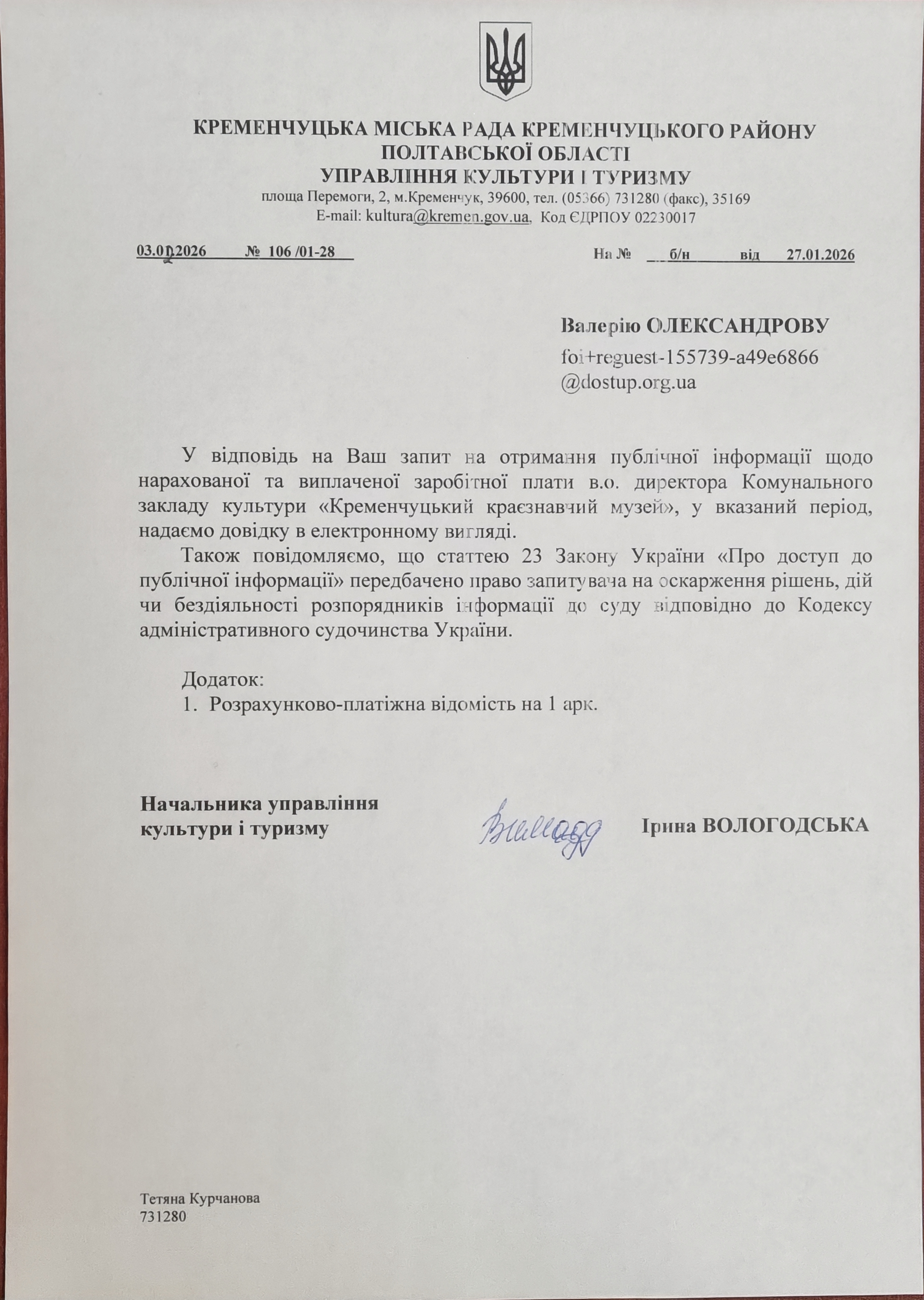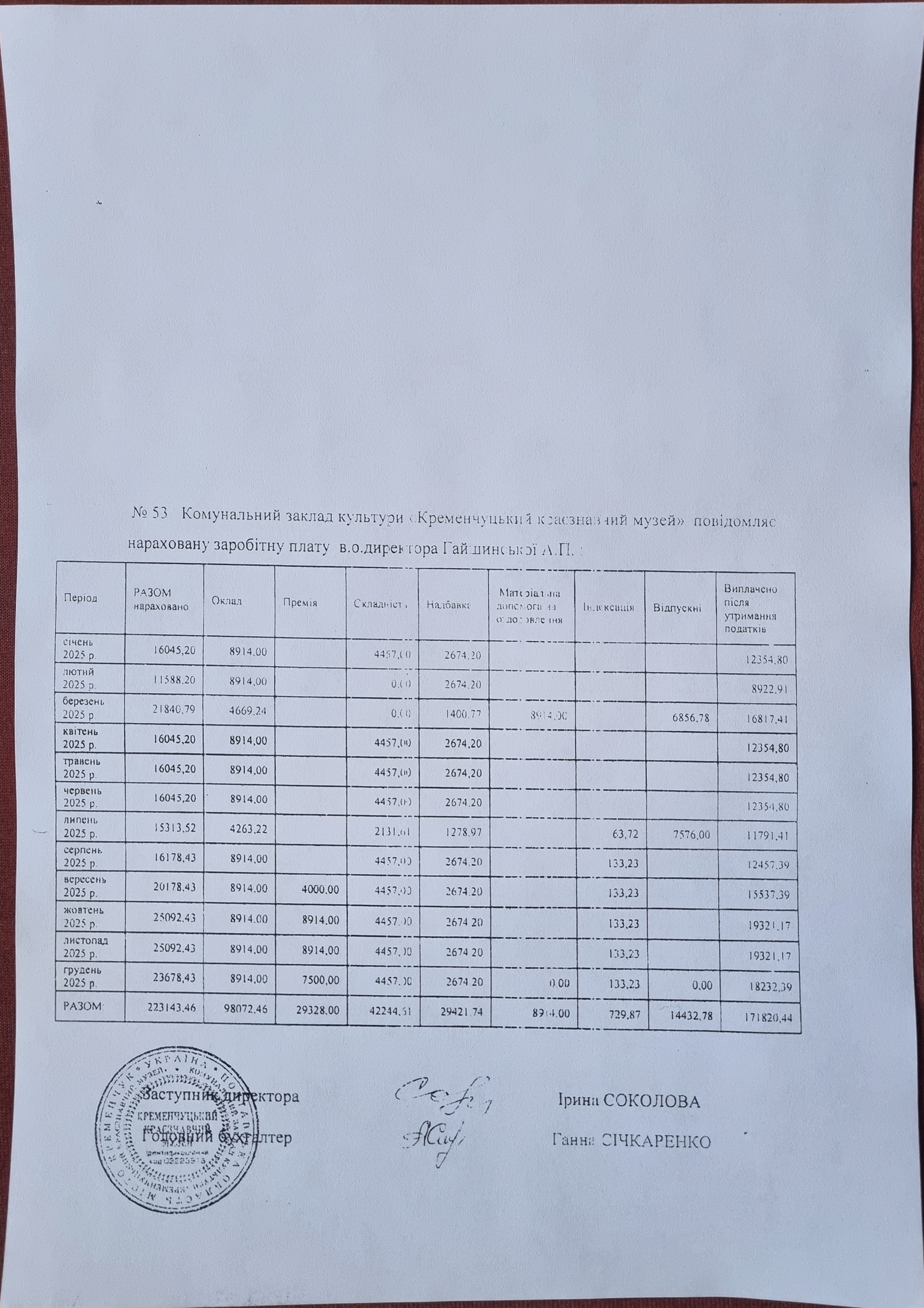 Розмір нарахованої та виплаченої заробітної плати Директорці Кременчуцького краєзнавчого музею за 2025 рік, окремо за кожним місяцем та за складовими заробітної плати.