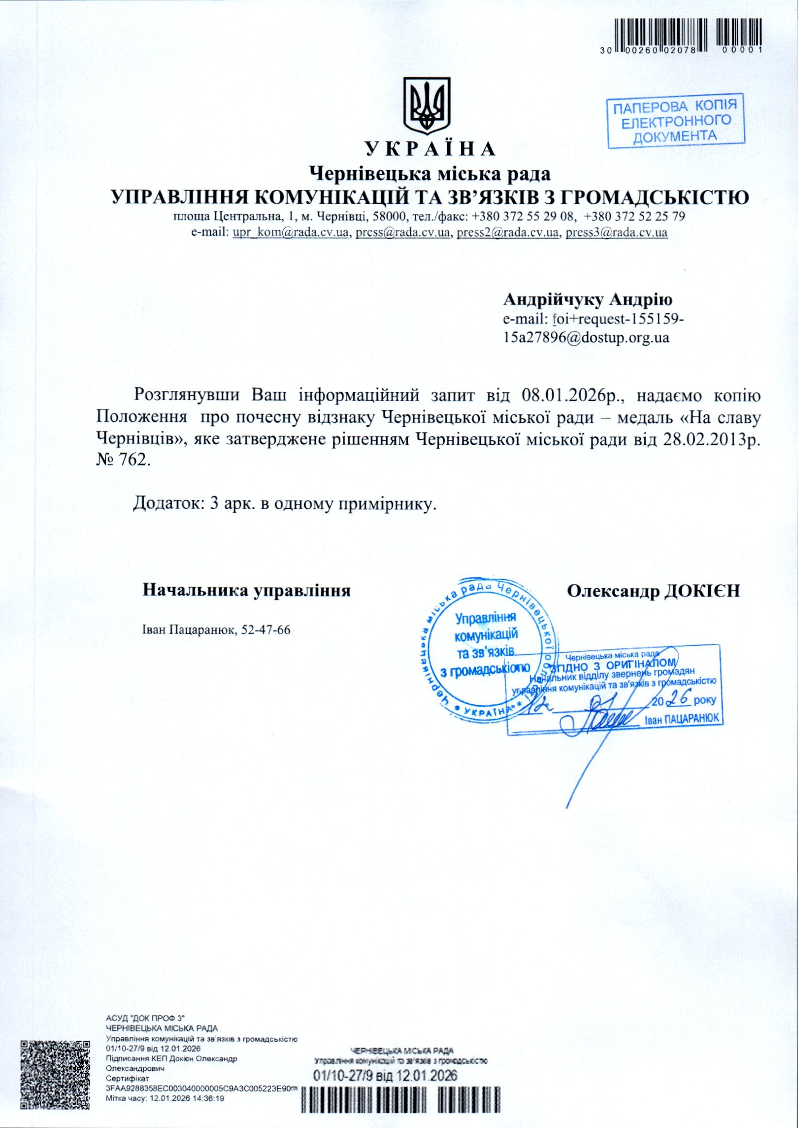1. Положення про почесну відзнаку Чернівецької міської ради – медаль “На славу Чернівців”, затвердженого рішенням Чернівецької міської ради VІ скликання від 28.02.2013 р. № 762.
