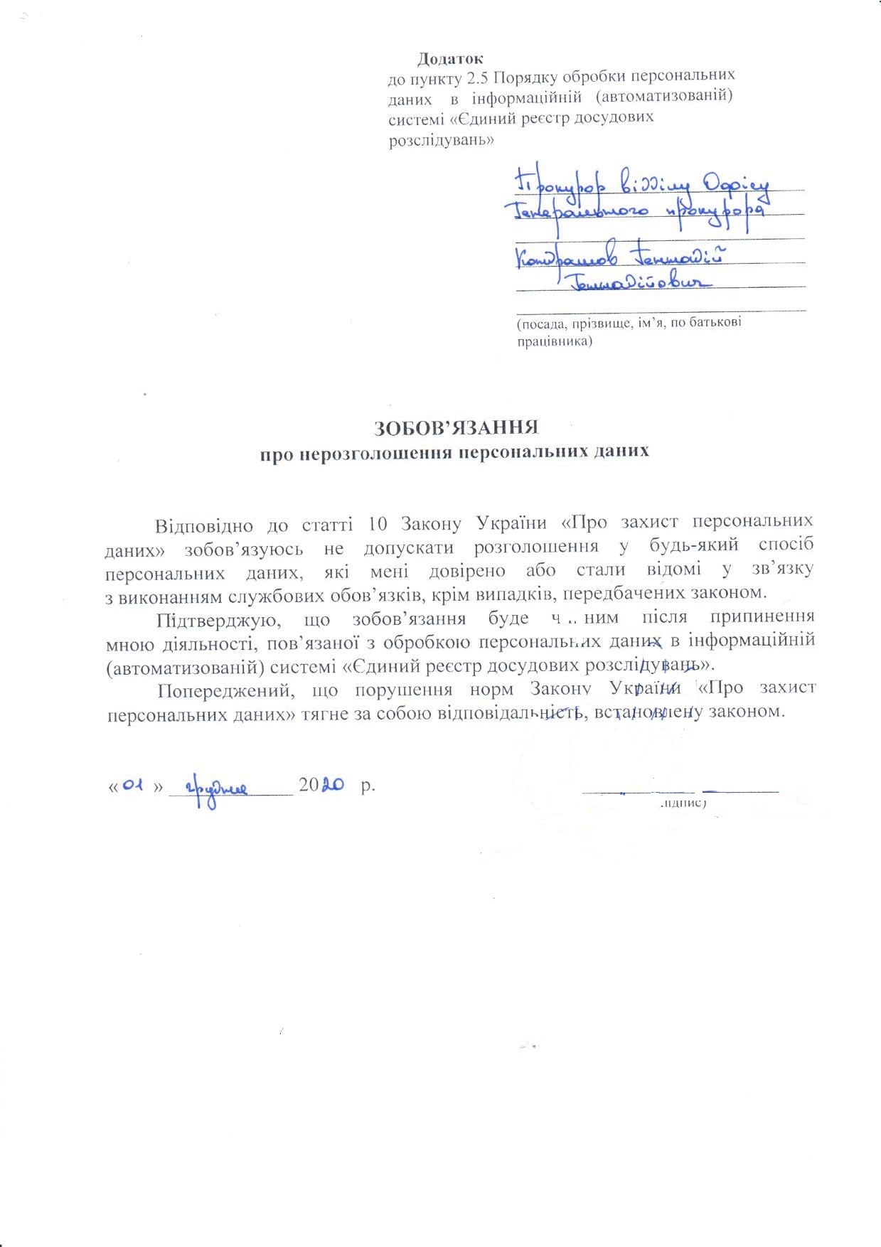(5) Надати інформацію чи має доступ до інформаційної (автоматизованої) системи «Єдиний реєстр досудових розслідувань» прокурор другого відділу управління процесуального керівництва досудовим розслідуванням та підтримання державного обвинувачення Департаменту нагляду за додержанням законів Національною поліцією України та органами, які ведуть боротьбу з організованою злочинністю, Офісу Генерального прокурора Кондрашов Геннадій Геннадійович і з якого часу та чи підписував він письмове зобов’язання про нерозголошення персональних даних, які стали йому відомі у зв’язку з виконанням службових обов’язків коли і яку кількість разів та надати скан-копію такого письмового зобов’язання;