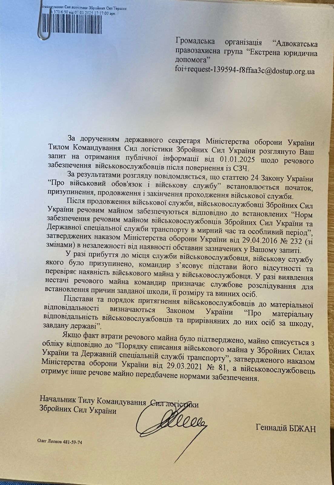 Щодо речового забезпечення військовослужбовців після повернення із СЗЧ