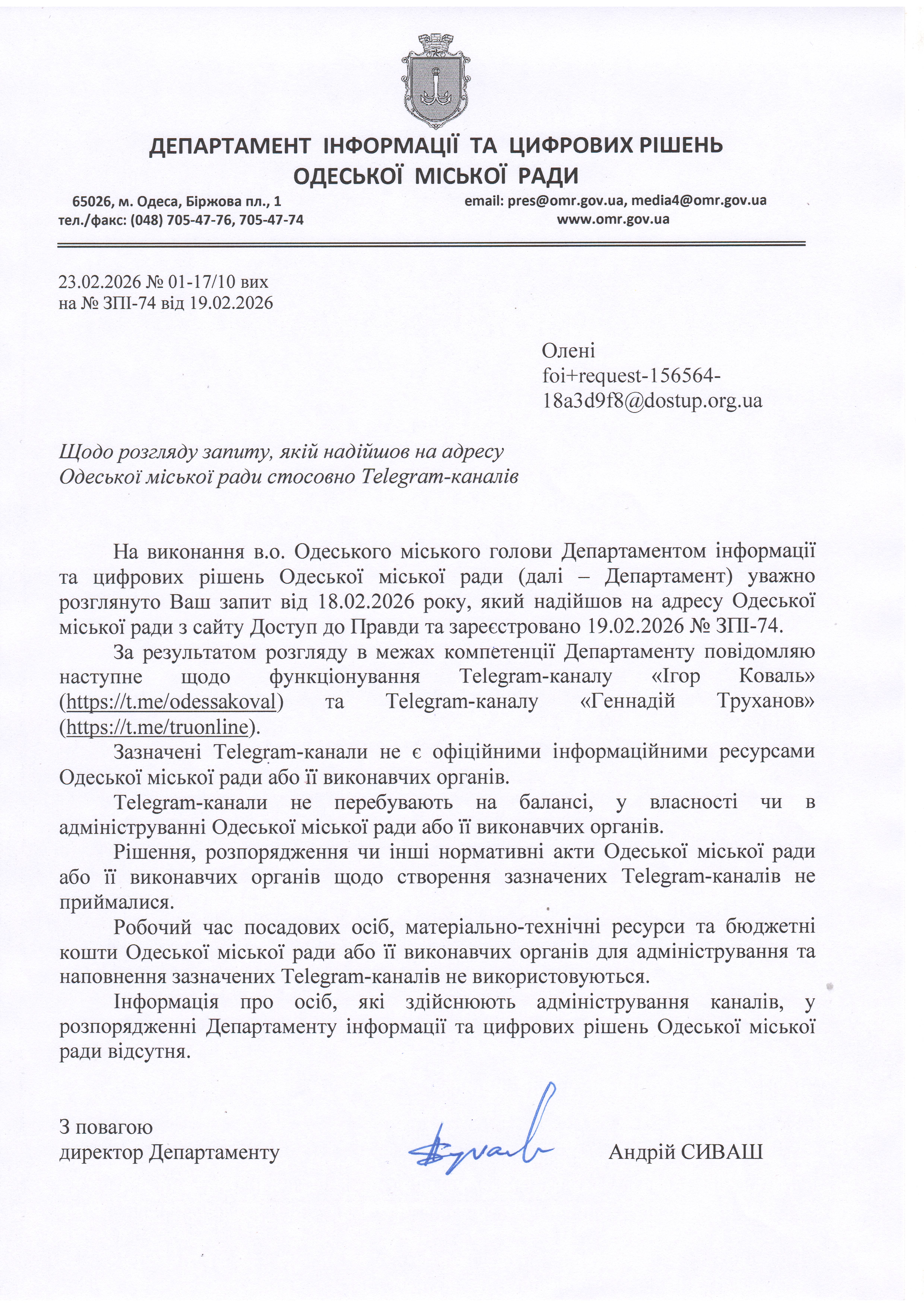 прошу надати інформацію щодо функціонування Telegram-каналу “Ігор Коваль”, username: https://t.me/odessakoval, який використовується для висвітлення діяльності виконуючого обов’язки Одеського міського голови, секретаря Одеської міської ради Ігоря Коваля і/або органу місцевого самоврядування.