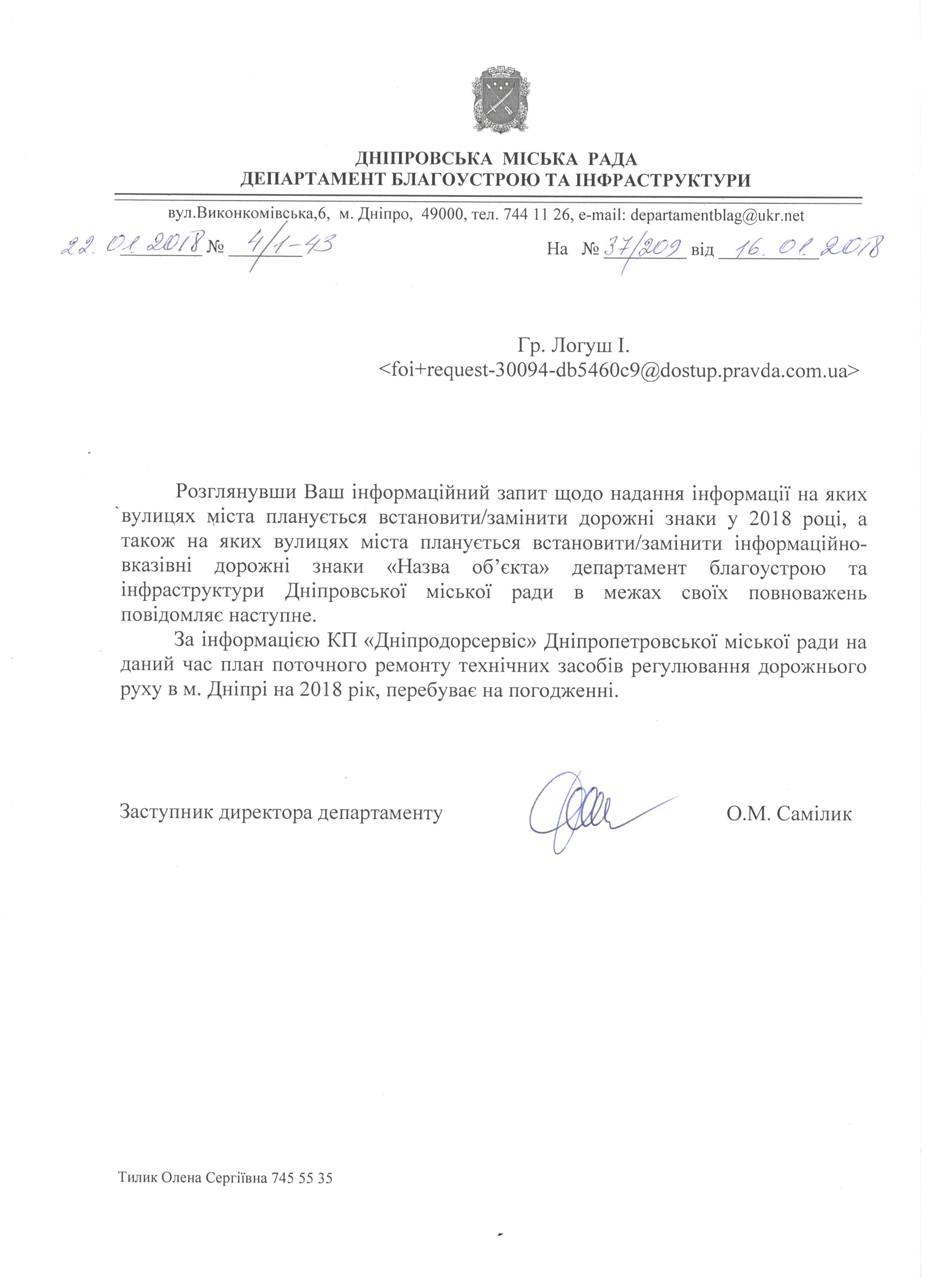 Щодо встановлення та заміна дорожніх знаків, встановлення інформаційно-вказівних знаків «Назва об’єкта» вулиць у Дніпрі