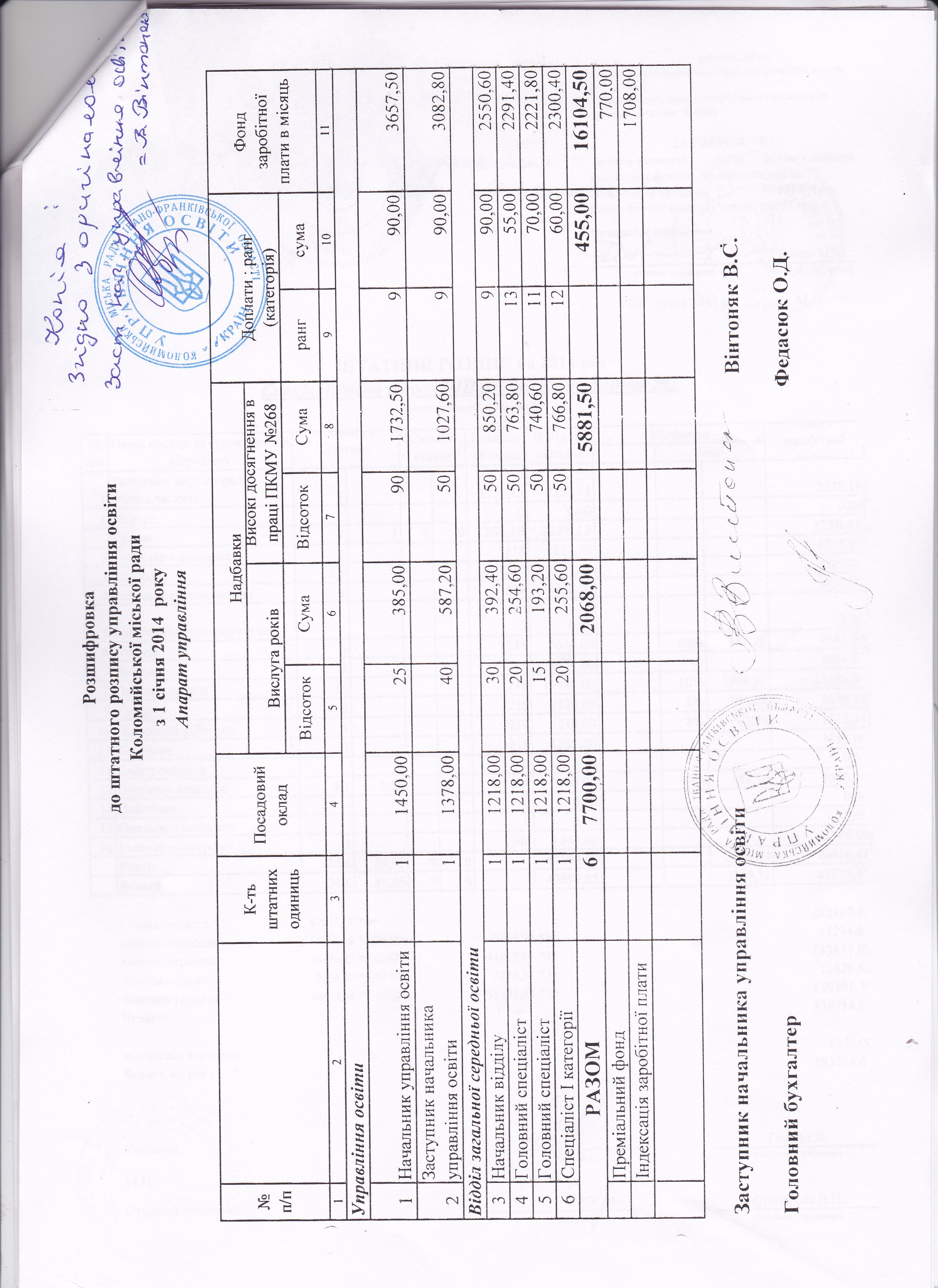 обслуговують, вакантні посади та діючі штатні розклади кожного закладу, а також штатний розклад міського управління освіти.