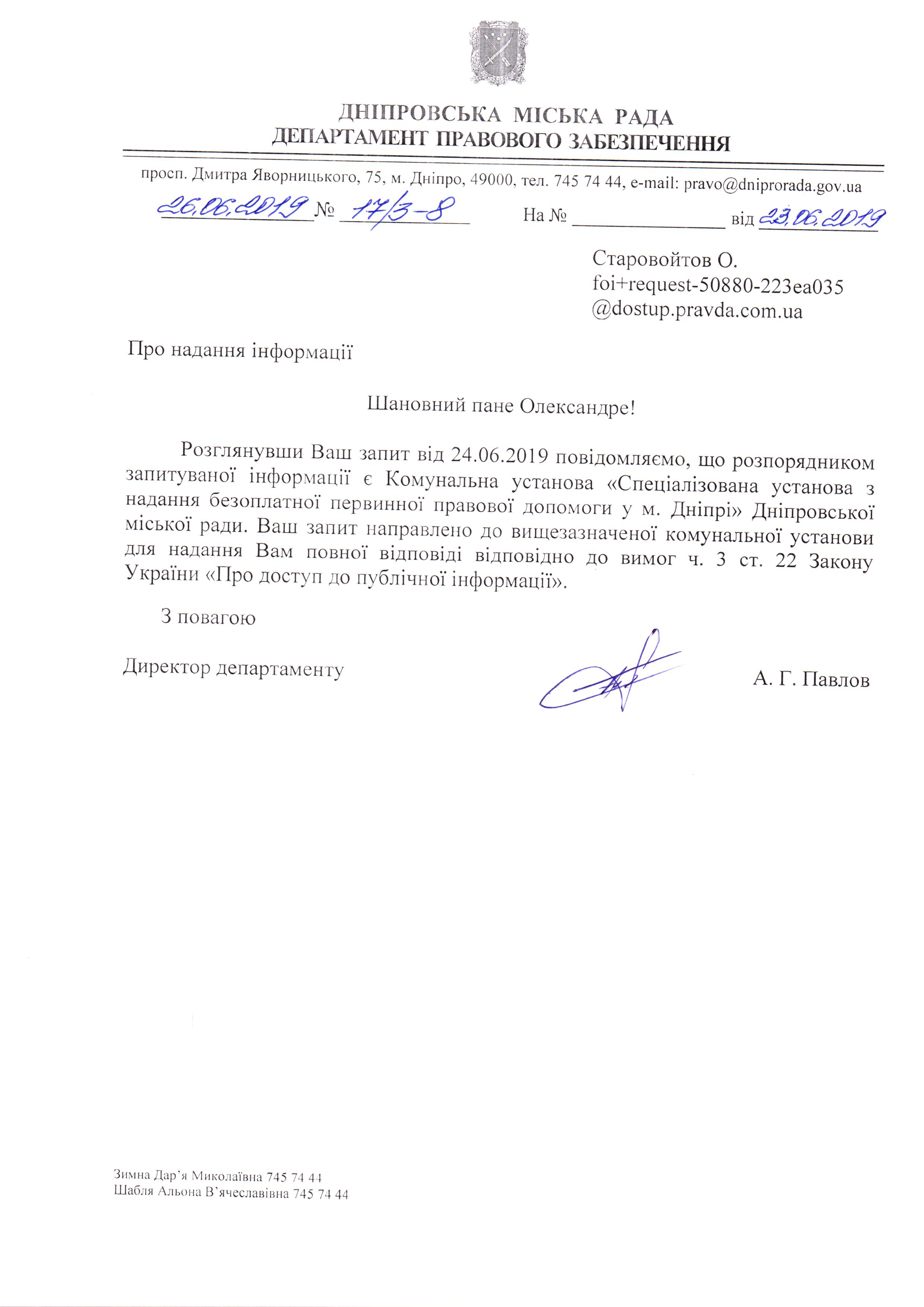 надання безоплатної первинної правової допомоги у м. Дніпрі" Дніпровської