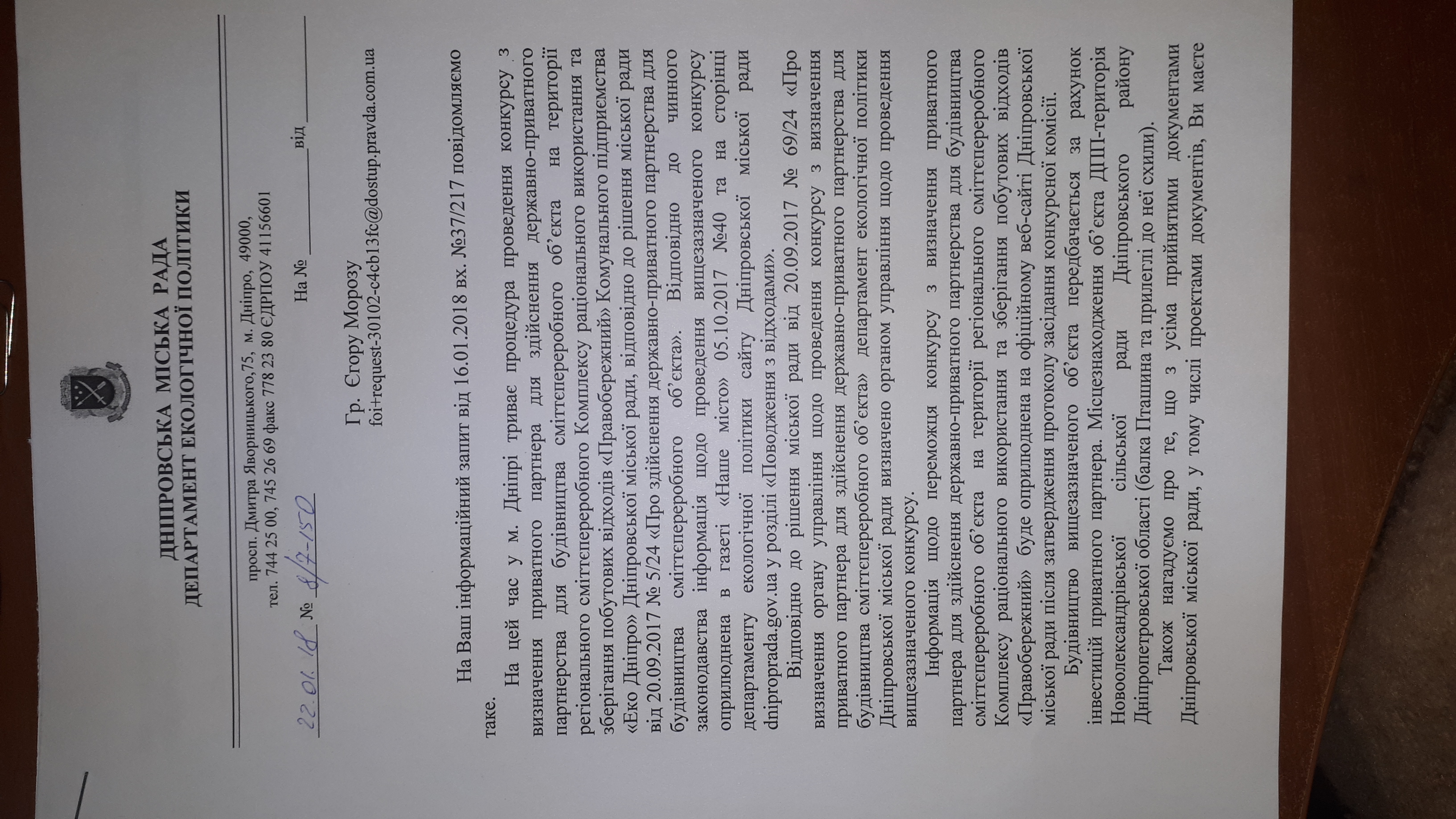 1. 15 січня 2018 року заступник міського голови Лисенко Михайло Олександрович говорячи про плани будівництва сміттєпереробного заводу в місті Дніпро заявив про те що тендер на його побудову виграла британська компанія.