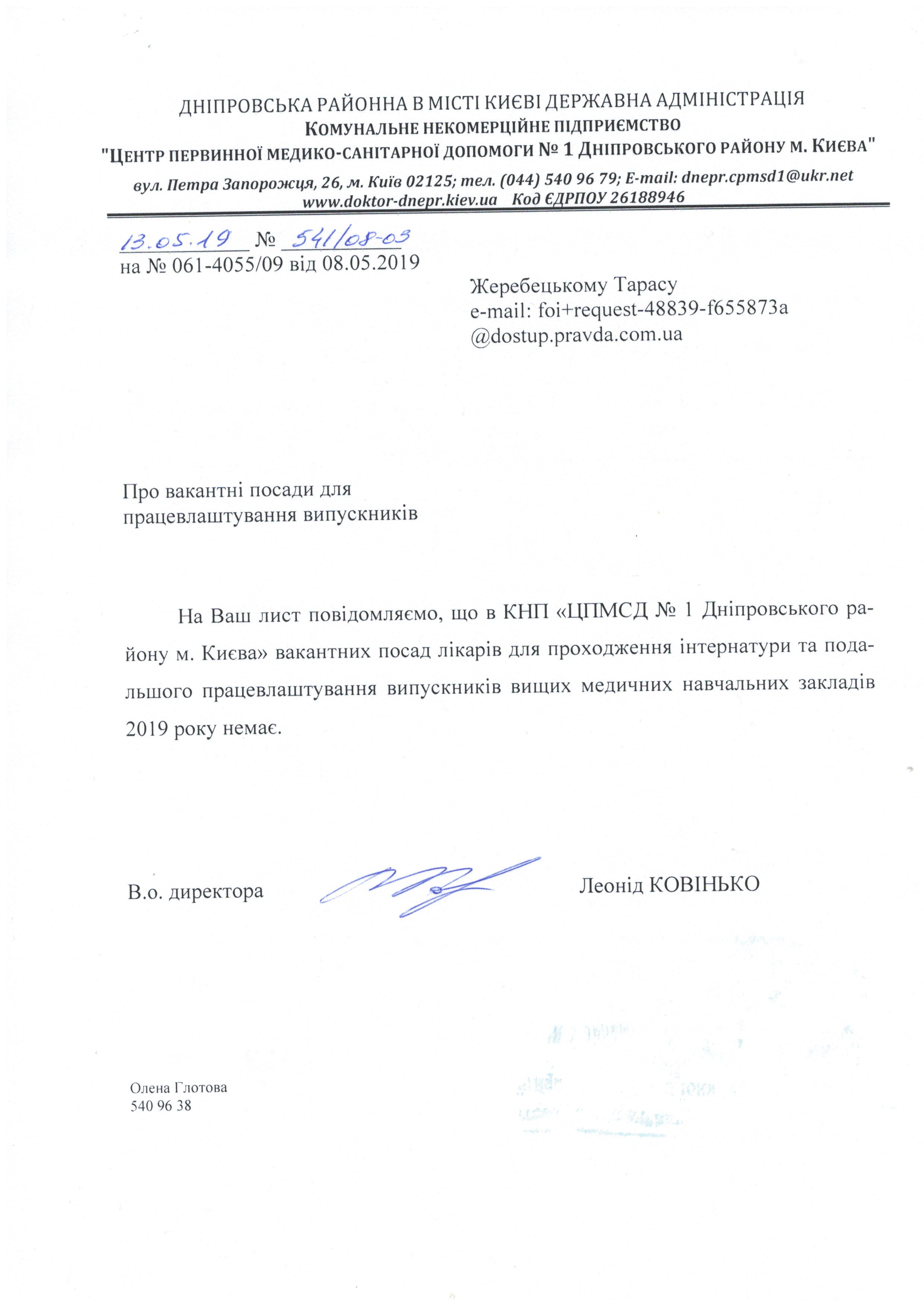 У відповідь на запит на публічну інформацію, за дорученням Департаменту охорони здоров’я виконавчого органу Київської міської ради (Київської міської державної адміністрації) № 061-4055/09 від 08.05.2019 р., адміністрація Дитячої клінічної лікарні № 8 Шевченківського району м. Києва доводить до Вашого відома, що станом на 13.05.2019 року вакантних посад для працевлаштування випускників вищих медичних навчальних закладів у лікарні немає.