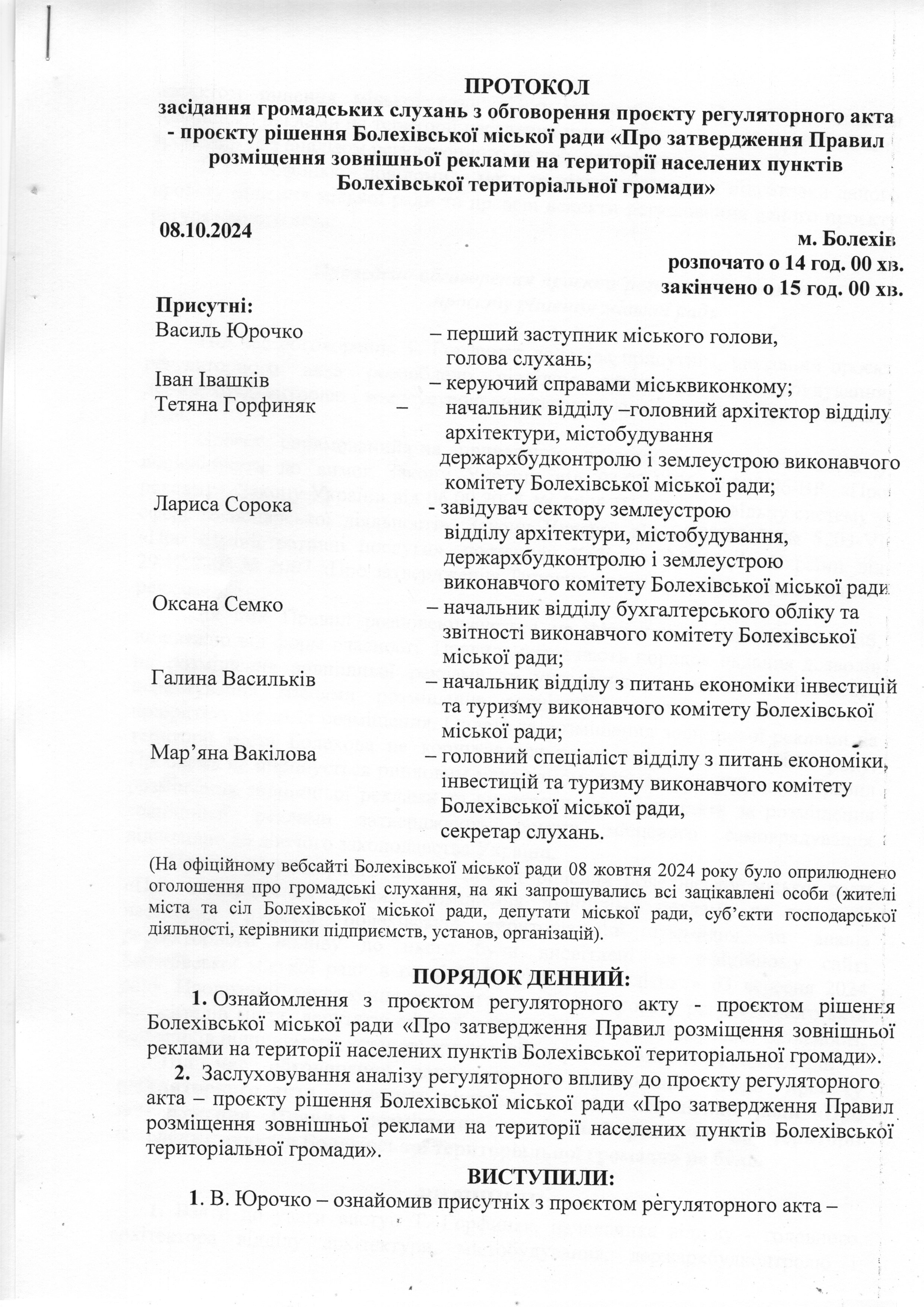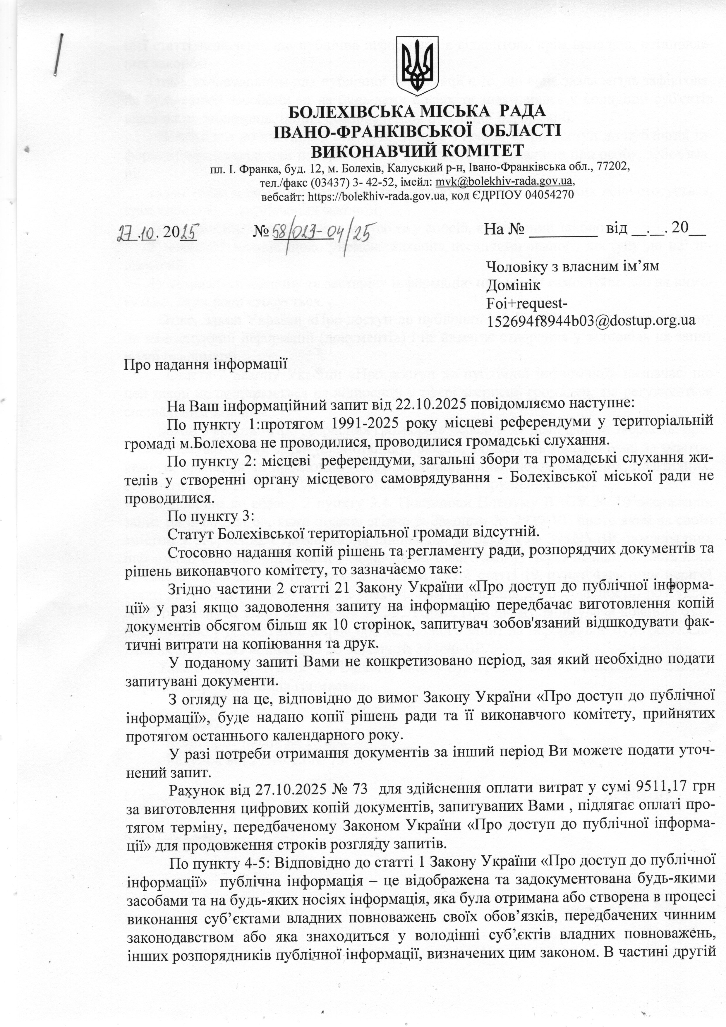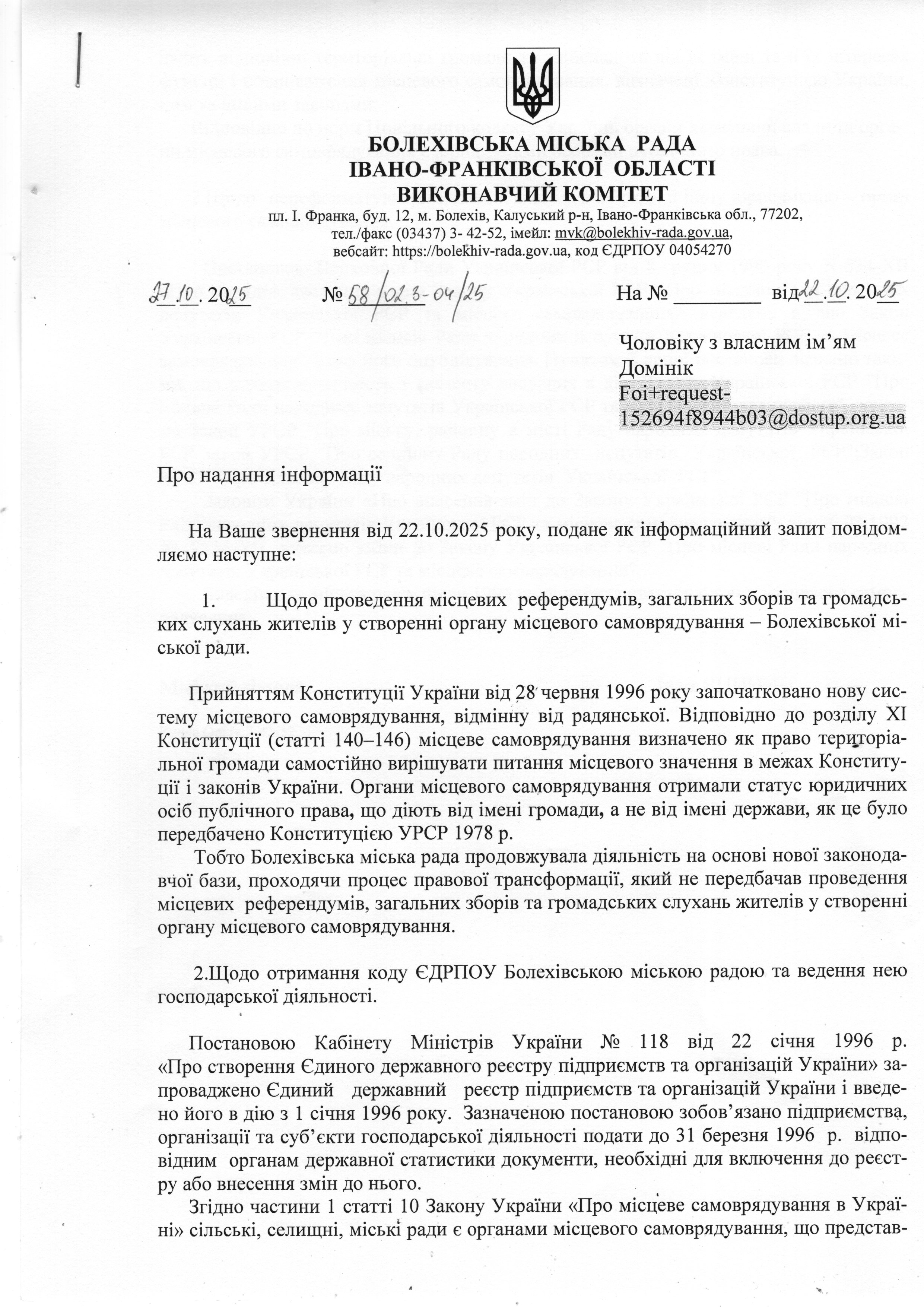 1. Чи проводилися місцеві референдуми, громадські збори та громадські слухання територіальної громади м.Болехів в період 1991-2025рр.? ( копії документів)