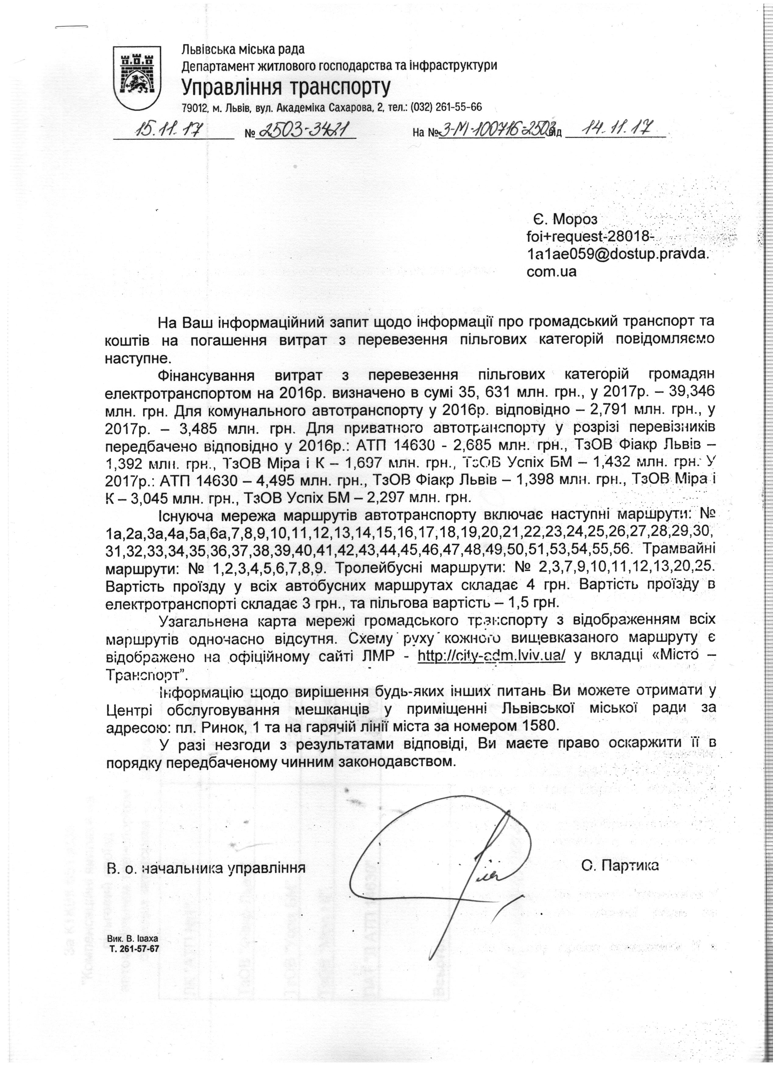 3. Суму коштів яка була надана авто-транспортним підприємствам та коммунальним підприємствам сфери транспорту які обслуговують маршрути громадського транспорту міста Львів на компенсацію збитків від перевезень пасажирів пільгових категорій у 2016 та 2017 роках
