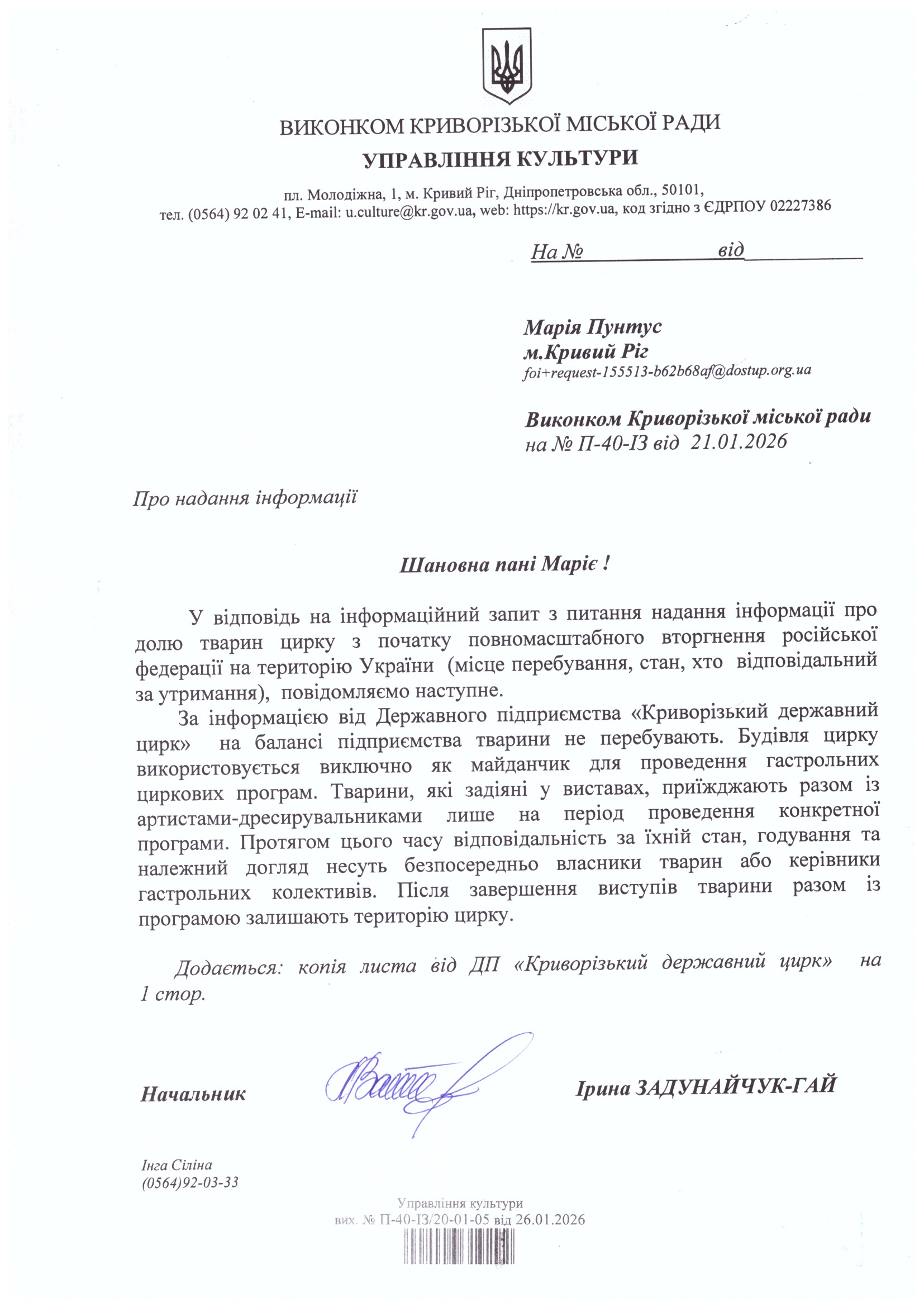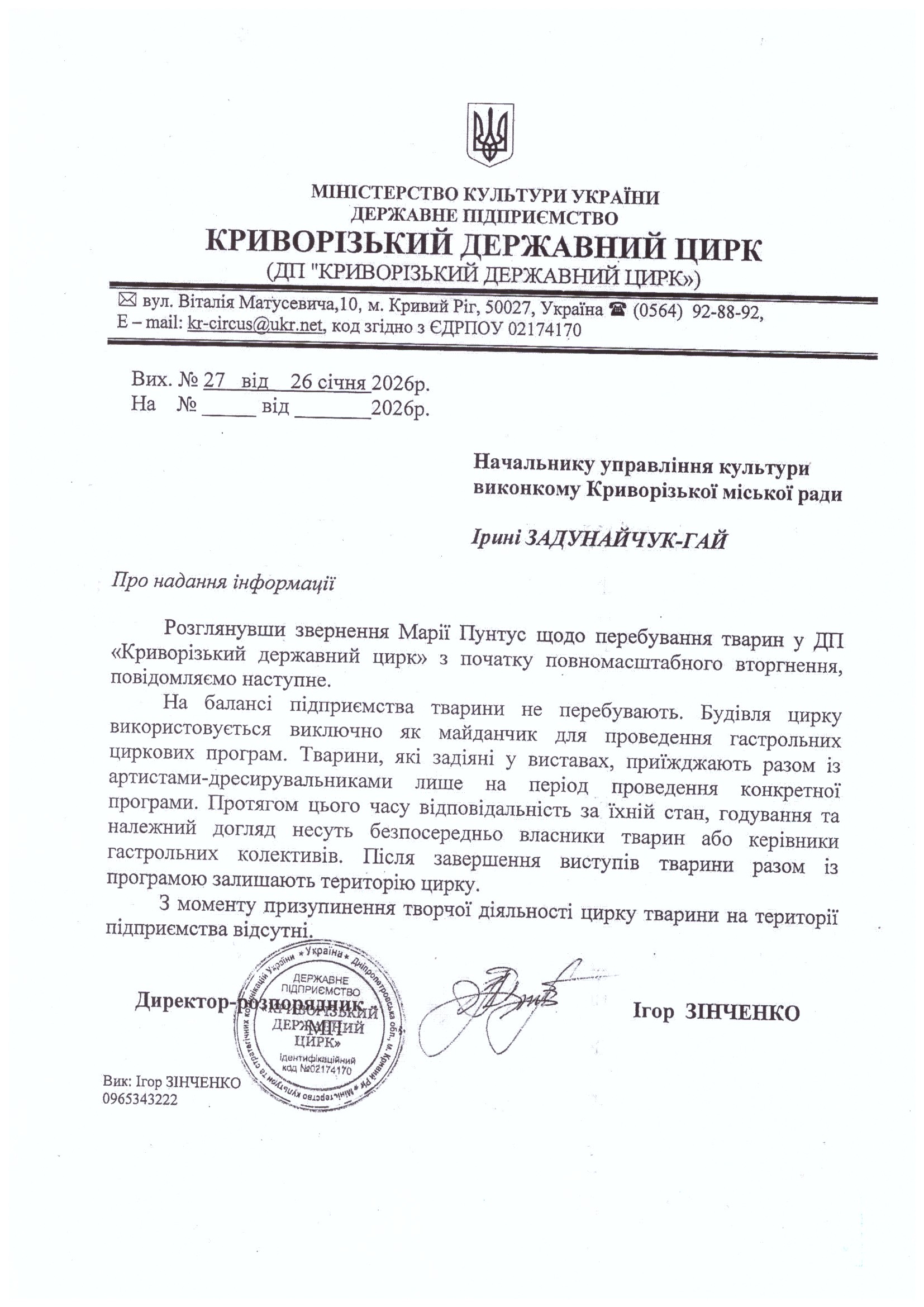 Просимо надати інформацію про долю тварин цирку з початку повномасштабного вторгнення: місце перебування, стан, хто відповідальний за утримання.