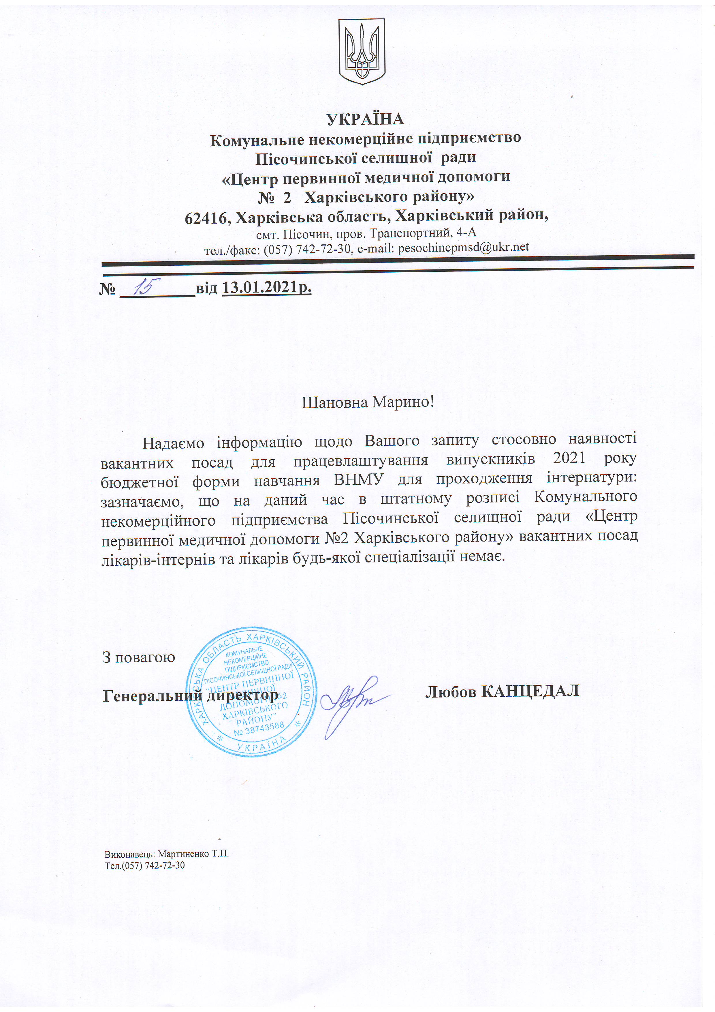 З повагою, Директор КП "Чугуївський міський ЦПМСД" , Тетяна Сабада.