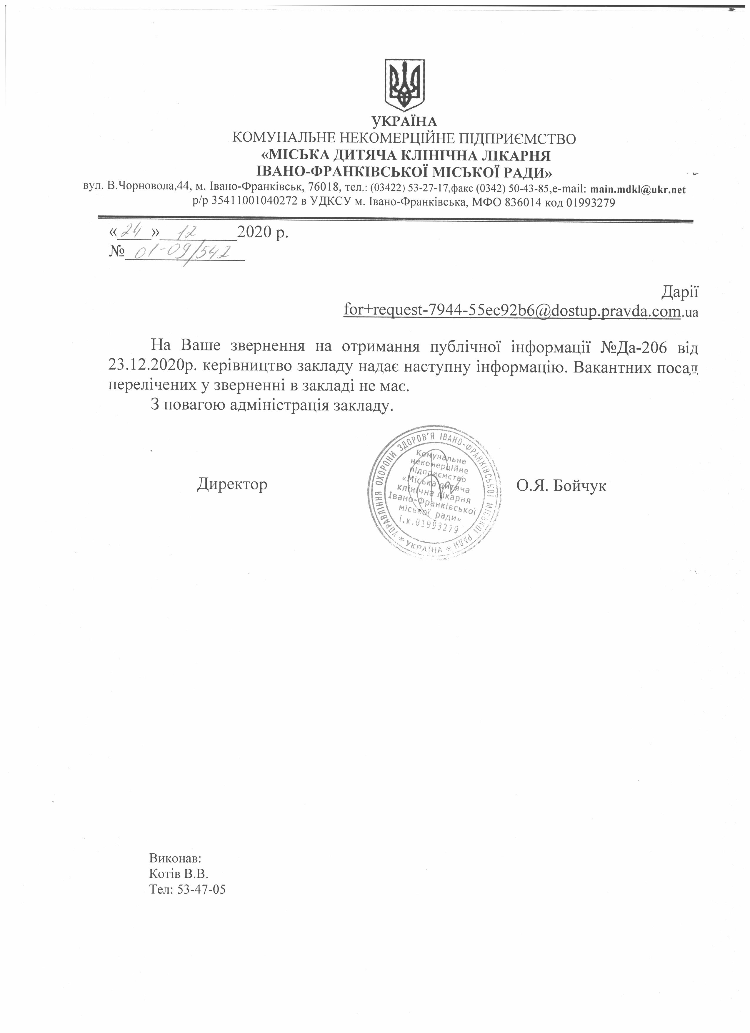 Доброго дня. Керівництво КНП "Богородчанська ЦРЛ" повідомляє про те, що вакантних посад немає.